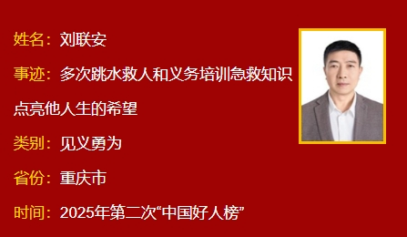 刘联安,男,1969年4月生,重庆市梁平区美术家协会理事、梁平区游泳协会副会长。2024年10月24日,刘联安在梁平区双桂湖跳入刺骨湖水,奋力救起一名已昏迷的落水女子,挽救了一条年轻的生命。这是他第三次下水救人。凭借过硬的游泳技能和急救知识,他多次在危急时刻挺身而出,协助警方抓捕犯罪嫌疑人,参与扑灭山火,义务培训游泳和急救知识,被群众誉为“生命托举者”。刘联安曾荣获“重庆好人”等荣誉。