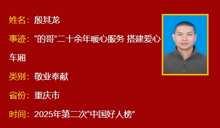 殷其龙,男,1975年9月生,中共党员,重庆市出租汽车公司第二分公司出租车驾驶员。从业20多年来,殷其龙以“爱岗敬业、奉献社会”作为行为准则,服务乘客超20万人次,安全行车超200万公里,成为零违章、零投诉、零事故的“三零”司机;他努力钻研、精益求精,多次在驾驶员技能比赛中获得优异成绩;他拾金不昧成为“爱心车队”的成员,将因过敏生命垂危的小孩及时送医,连续6年免费接送耄耋老人看病就医,在紧急防汛期参与抗洪抢险任务运送抢险物资到防汛一线。殷其龙曾荣获“全国五一劳动奖章”“全国劳动模范”等荣誉。