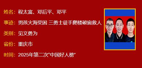 程太富,男,1950年3月生;邓后平,男,1972年2月生;邓平,男,1985年7月生。三人皆为重庆市万州区双河口街道居民。2024年9月23日,双河口街道双河组团B区3楼突然起火,一名患有智力障碍的男孩受困。生死关头,程太富、邓后平和邓平不顾危险,在没有任何保护措施的情况下,冒着浓烟和高温实施接力救援,帮助男孩成功脱险。他们的英勇事迹被拍下并传至网络,引发广泛关注和点赞,网友纷纷称他们为“勇士”。三人荣获“重庆好人”等荣誉。