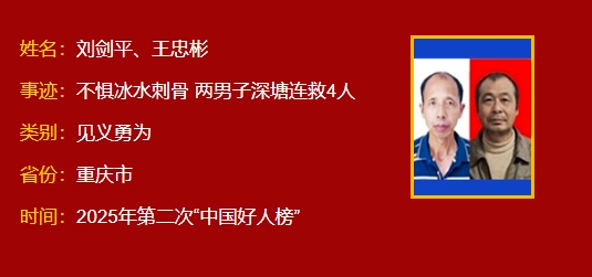 刘剑平,男,1966年2月生,重庆市永川区某公司客车司机;王忠彬,男,1969年5月生,重庆市永川区朱沱镇福良村村民。2024年12月12日,在永川区朱沱镇围子山村,一辆私家车不慎坠入鱼塘,车辆倒扣,车内4名乘客生命垂危。危急时刻,刘剑平、王忠彬挺身而出,在两人合力救援下,落水4人化险为夷。二人荣获“重庆好人”等荣誉。
