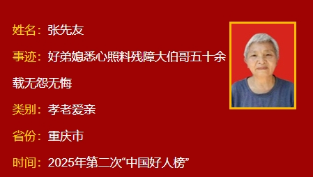 张先友,女,1952年5月生,重庆市荣昌区清江镇塔水村村民。从喂饭擦身到清理排泄物,在半个多世纪的岁月里,张先友以超乎常人的耐心事无巨细地照料着智力残疾的大伯哥雷桂亨的生活起居。特别是在大伯哥瘫痪的近8年间,她依旧不厌其烦精心照顾。如今雷桂亨已93岁高龄,成为家族最长寿者。从青丝到白发,54年始终如一,这份超越血缘的亲情在张先友的坚守中愈发厚重。其家庭曾荣获“重庆最美家庭”等荣誉。