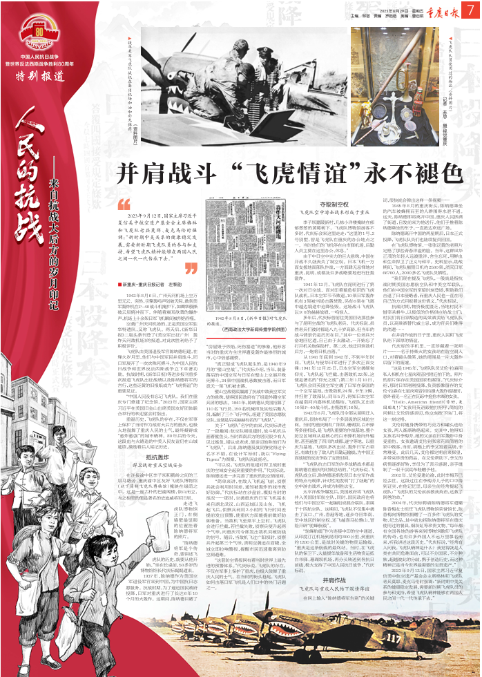 飞虎队由美国退役军官陈纳德组建,在烽火岁月里,他们与中国军民并肩战斗,同日军展开了一次次殊死搏斗,为中国人民抗日战争和世界反法西斯战争立下卓著功勋。抗战时期,《新华日报》等进步报刊曾多次报道飞虎队出征战绩以及陈纳德将军的言行,这些泛黄的旧报纸成为“飞虎情谊”的重要见证。