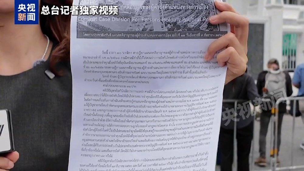 总台记者杨探骊:我现在是在泰国最高法院,当地时间9月9日,泰国最高法院对前总理他信住院期间涉嫌规避服刑一案作出判决。我们在法院现场领取了判决书,上面写道,“他信于2023年8月31日,得到国王特赦,原判刑减少至仅需再服刑1年。但由于被告被执行刑罚的过程不符合法律规定,且被告在警察医院期间不得视为正式服刑天数,被告因此还需继续服刑一年”。泰国狱政厅已将他信当场带离最高法院。