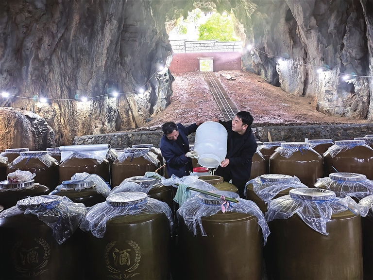 “洞藏能让原酒在自然封闭环境中慢慢陈化,酒体变得更细腻醇厚,市场认可度特别高。”谭林介绍,目前基地已为企业和个人储藏白酒7吨,村集体通过收取管理费,每年又多了一笔稳定收入。