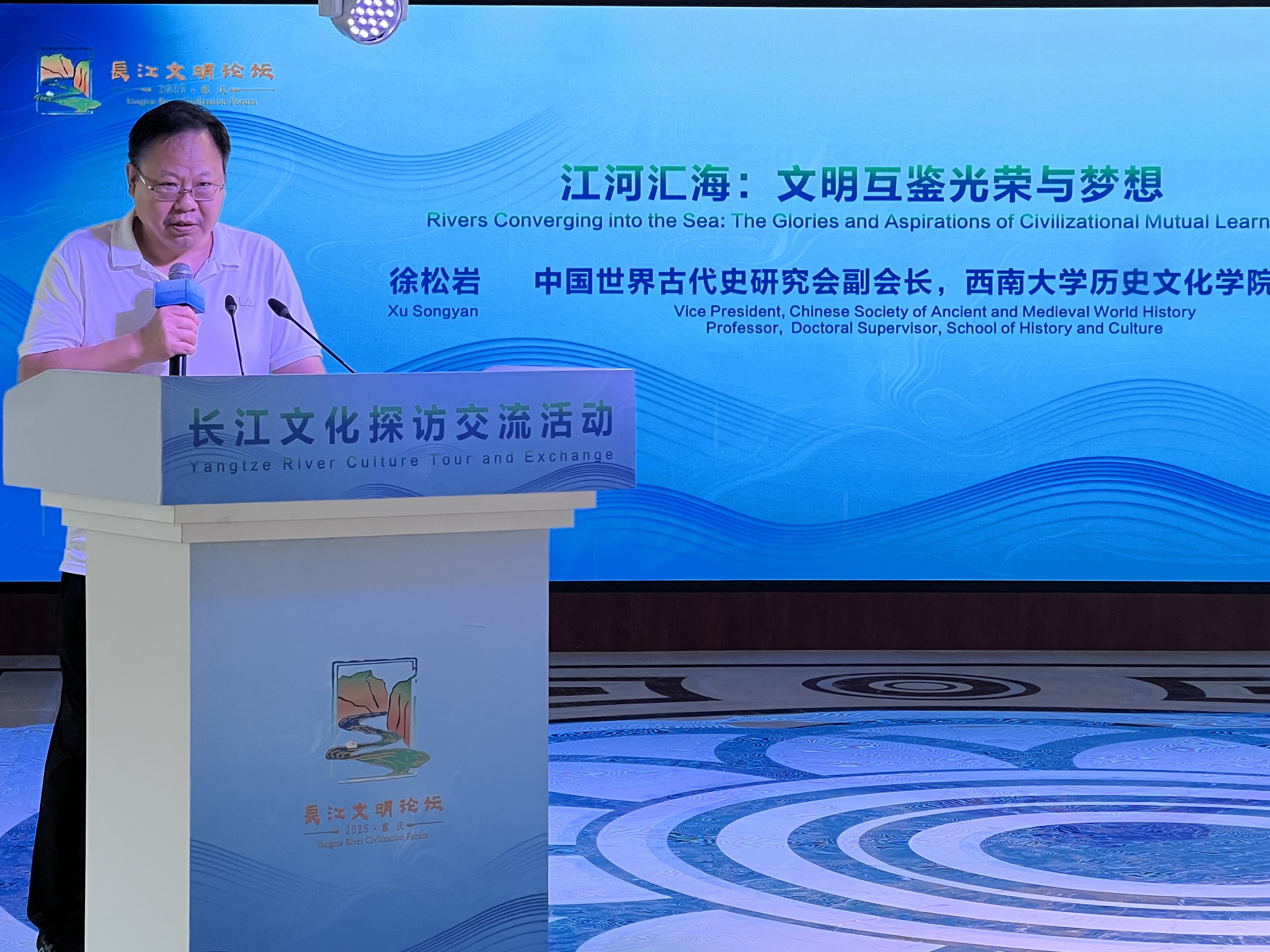 作为2025长江文明论坛的重要活动之一,长江文化探访交流活动于2025年9月18日正式启动。交流活动现场,中国世界古代史研究会副会长、西南大学历史文化学院教授徐松岩以《江河汇海:文明互鉴光荣与梦想》为题进行分享,从历史维度深入阐释人类文明互鉴发展的宏大历程。