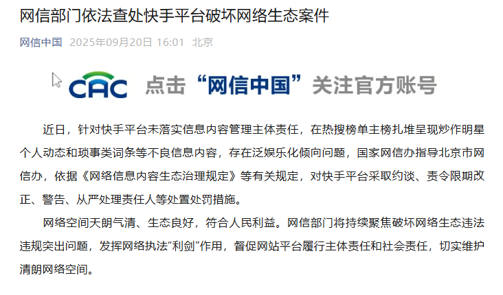 近日,针对快手平台未落实信息内容管理主体责任,在热搜榜单主榜扎堆呈现炒作明星个人动态和琐事类词条等不良信息内容,存在泛娱乐化倾向问题,国家网信办指导北京市网信办,依据《网络信息内容生态治理规定》等有关规定,对快手平台采取约谈、责令限期改正、警告、从严处理责任人等处置处罚措施。