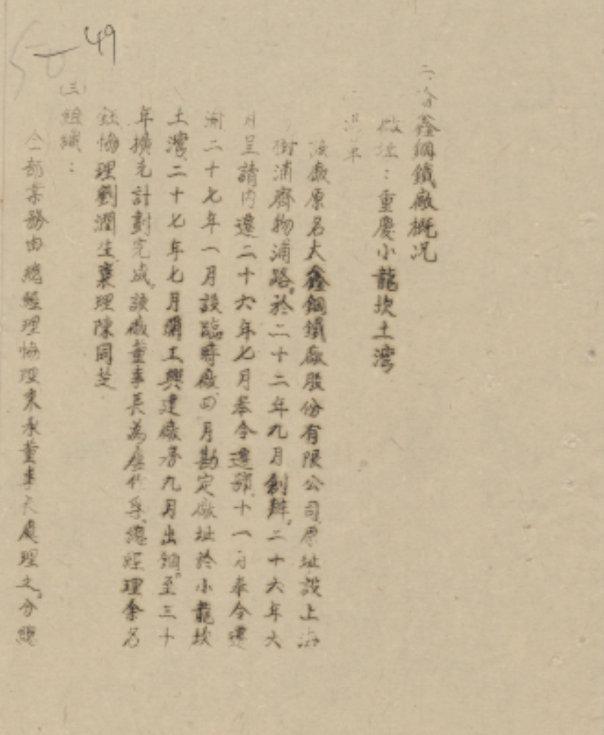 刚开始,余名钰颇感人地生疏,恐无法立足,“于是一面商洽运输,一面电询川中情形”。没想到,民生公司创始人卢作孚主动表达了合作意向。1938年2月,双方签订合作营业协议,大鑫钢铁厂以机器设备及价值25万元的五金材料作为股本,民生公司以7万元运费、18万元现金作为股本,双方合资50万元成立大鑫钢铁渝厂股份有限公司,1938年9月更名为渝鑫钢铁厂股份有限公司。