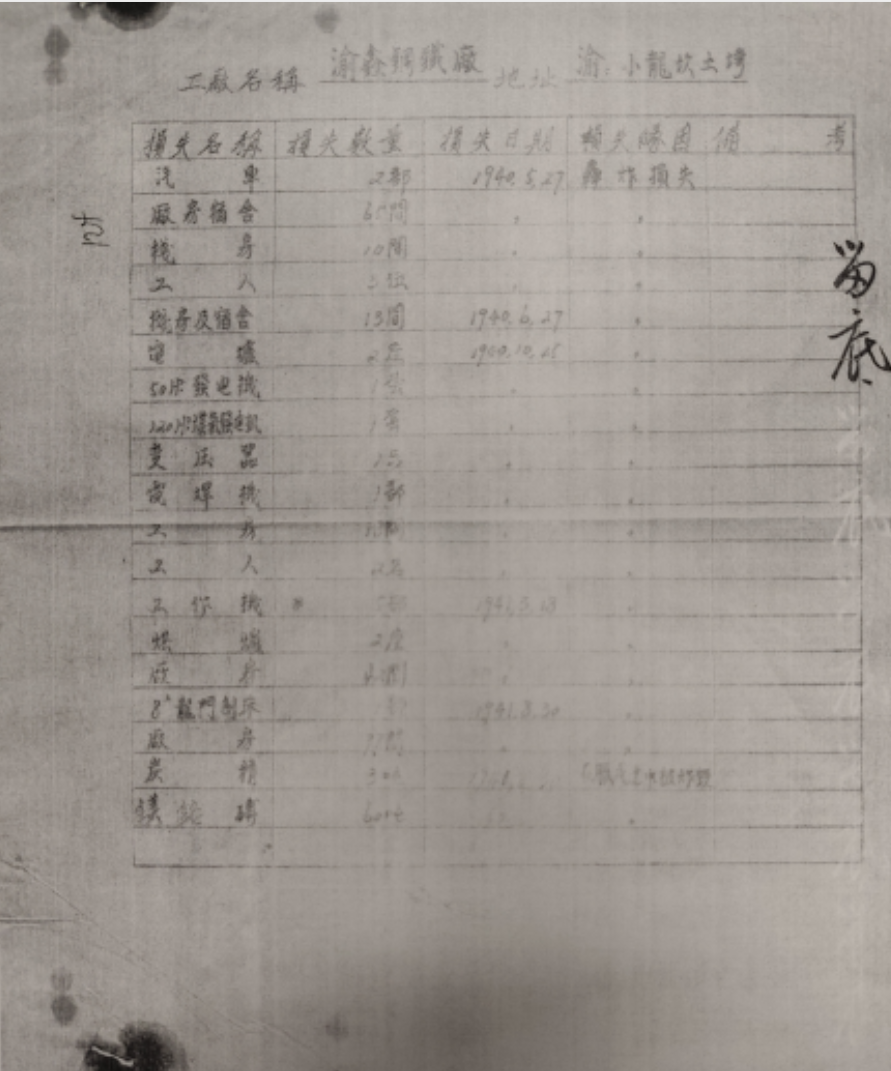 据统计,从1940年5月至1941年8月,渝鑫钢铁厂共遭受日机5次轰炸,每次落弹多者达30余枚,少亦10余枚,共被炸毁房间180间、器具6.5万件、图书180册,造成直接损失60余万元,间接损失高达130余万元。