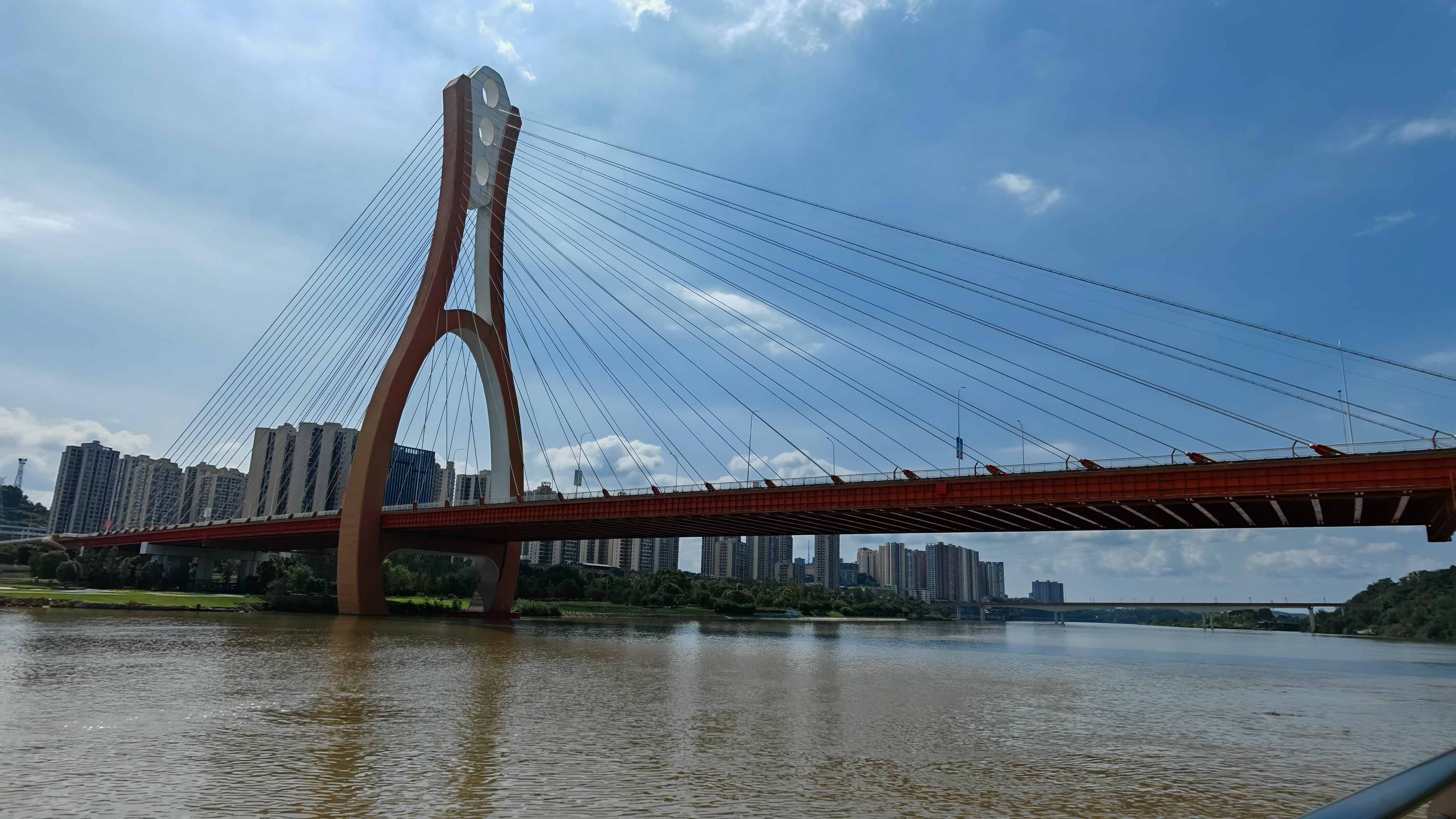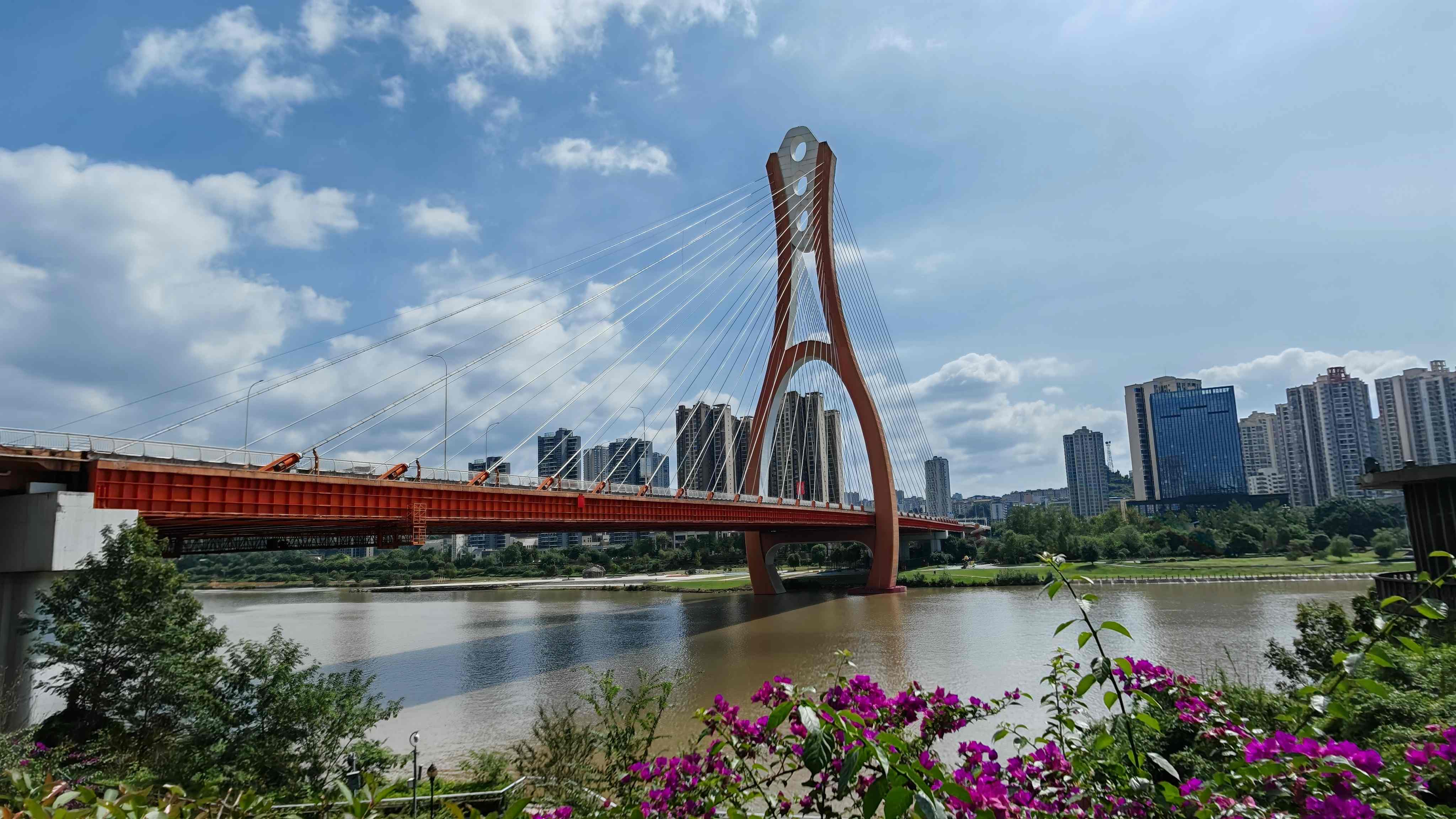 那高高的塔柱,以宝瓶塑形,犹如智慧之眼,圆润柔美,曲线顺畅;又似美人玉立,袅娜多姿,娉婷婉转。那斜拉的钢索,成伞状排列,宛若巨型竖琴,在涪江之上,在天地之间,悠悠迎风招展。在潼南之城,巍然耸立新地标。