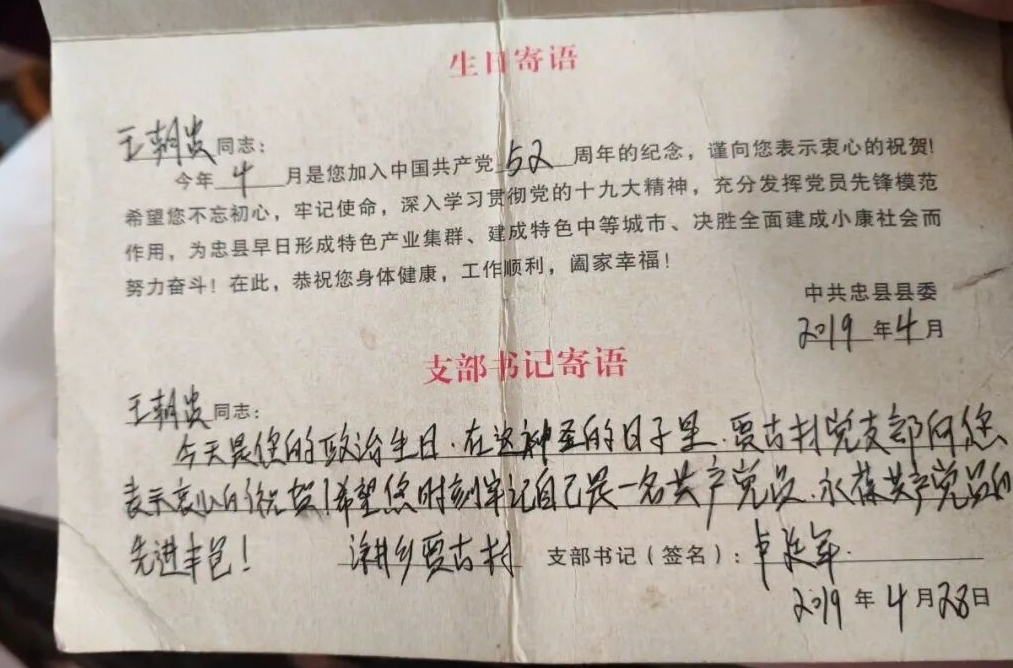 如今,因年岁渐高无法劳作,王朝贵跟随两个儿子生活。作为农民党员,虽然王朝贵每月只需交纳0.2元—1元的党费,但在2018年的一次组织生活会后,他将1000元大额党费现金交到了村党支部书记手中。“党的恩情重如山,感谢党还记着我。我老了,不能为党出力了,就想用这点心意报答。”他激动地说。