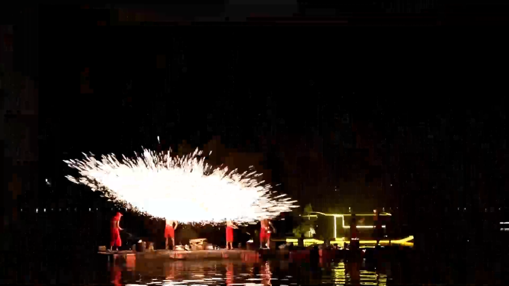 “打铁花”与“水上火壶”表演点亮夜空,滚烫的铁水在击打下,划出金色的流光。手持火壶的艺人踏浪逐火,在夜空中不断迸发出绚烂的火焰。