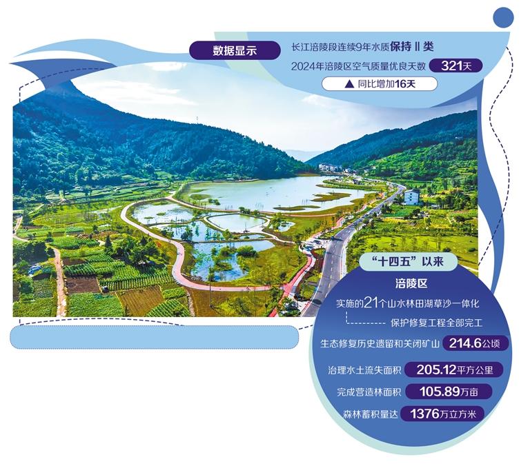 涪陵区地处三峡库区腹心地带。“十四五”以来,当地深入践行绿水青山就是金山银山理念,打生态牌、走生态路,统筹推进高水平保护和高质量发展、高品质生活、高效能治理,长江上游重要生态屏障进一步筑牢。数据显示,长江涪陵段连续9年水质保持Ⅱ类;2024年涪陵区空气质量优良天数达321天,同比增加16天。