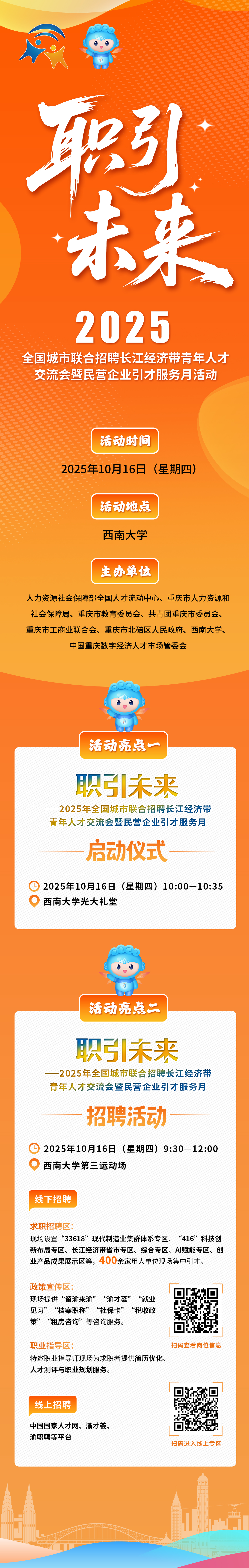 为助力青年人才高质量就业,服务长江经济带发展,赋能民营企业引才育才,“职引未来—2025年全国城市联合招聘长江经济带青年人才交流会暨民营企业引才服务月”将于10月16日在西南大学盛大启幕。400余家优质企业齐聚现场,覆盖多行业多领域,为高校毕业生等青年人才带来海量岗位与一站式就业服务。
