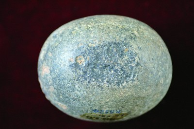 在这些石器之中,有一件显得与众不同——它通体圆润,只在一侧稍显平坦,且有着些许浅浅的坑疤。