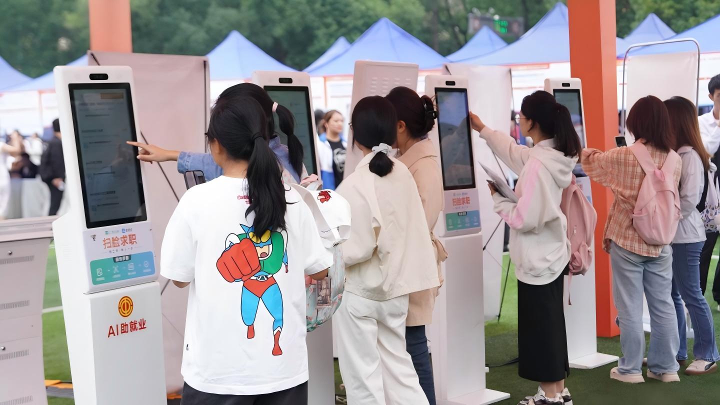 活动现场的AI赋能专区成为最大亮点,吸引了众多学子前来体验。专区里配备了智慧就业一体机、就业服务一体机、简历打印一体机、面试一体机等多款智能硬件设备。提供从职业规划到能力评估、简历优化、面试辅导,再到岗位匹配,甚至创业指导的一整套服务,覆盖了求职就业的各个环节,形成了全链条的服务体系。