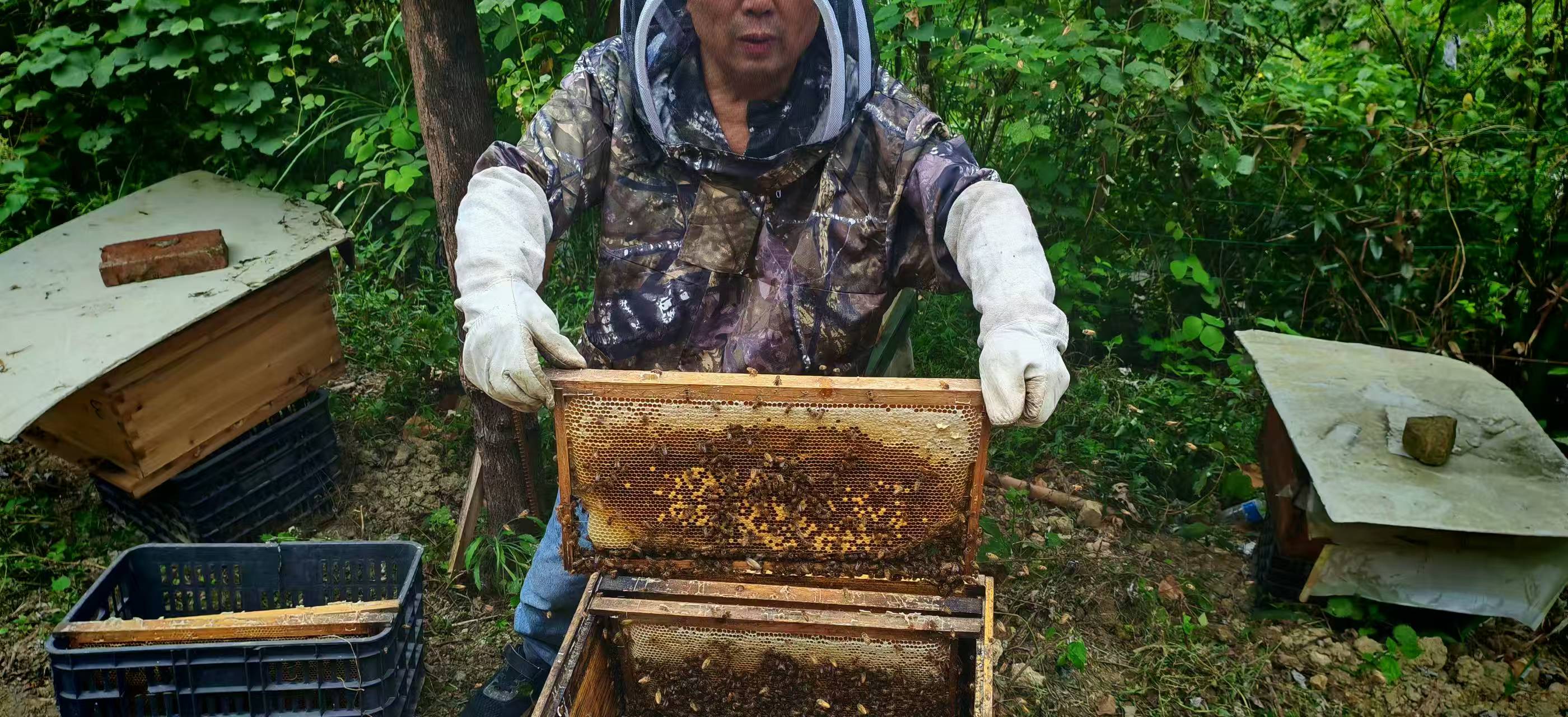 从万盛城区过去10多分钟便到了二郎山,罗大哥养蜂的地方紧挨观顶寺下院。沿着台阶往上几米,一条小道通往山上,小路两旁错落平放着几十个蜂箱,一些蜜蜂嗡嗡飞舞,两三个工人穿着网状防蜂服来回忙碌。他们打开一个蜂箱,里面放着六七块巢架,每块巢架上密密麻麻爬满了蜜蜂。只见工人双手提起其中一块巢架轻轻一抖,蜜蜂便纷纷掉落到箱中,然后把取出的巢架放到另一个空着的箱子里,再拿起另一块。