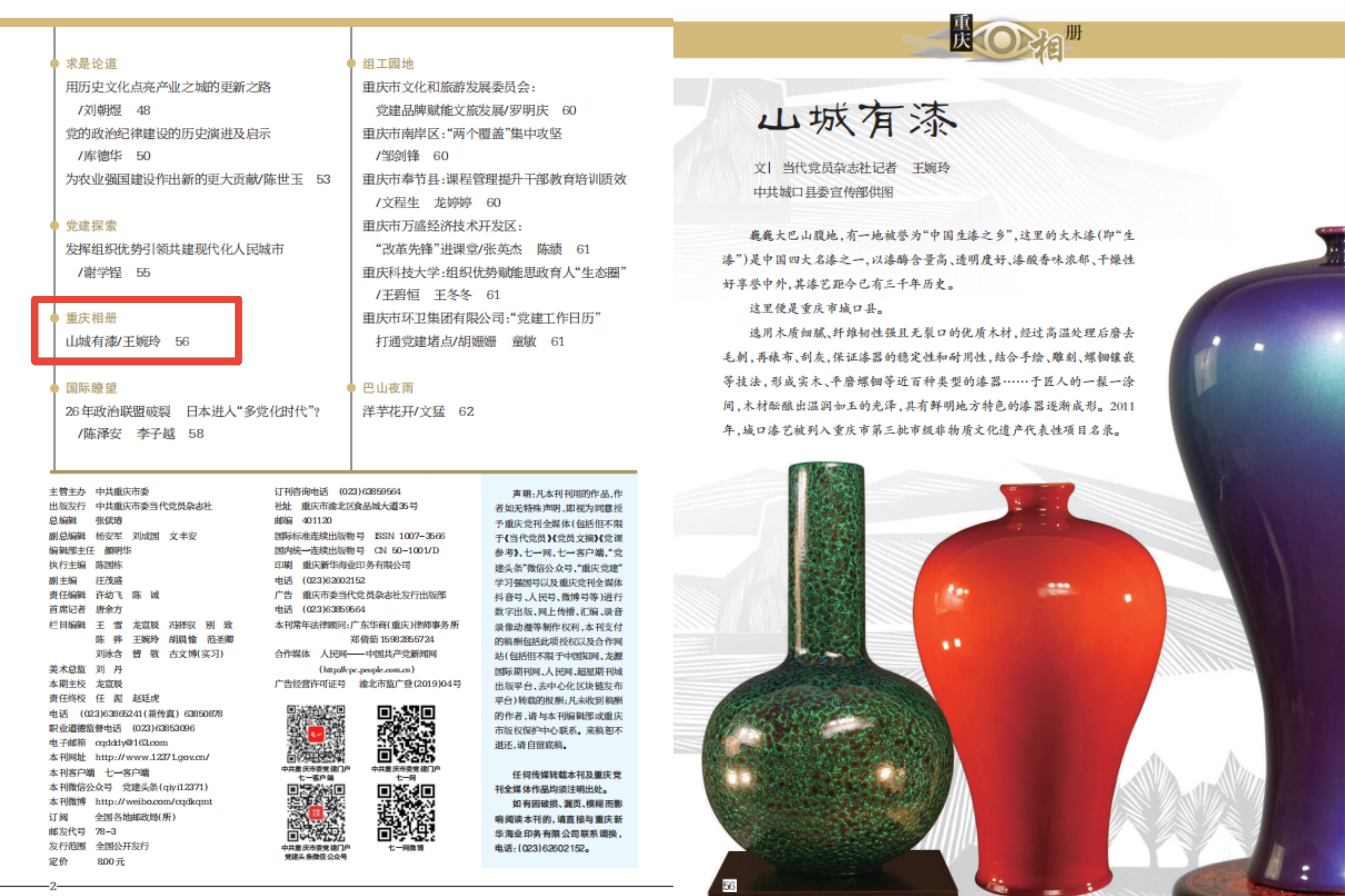 选用木质细腻、纤维韧性强且无裂口的优质木材,经过高温处理后磨去毛刺,再裱布、刮灰,保证漆器的稳定性和耐用性,结合手绘、雕刻、螺钿镶嵌等技法,形成实木、平磨螺钿等近百种类型的漆器……于匠人的一髹一涂间,木材酝酿出温润如玉的光泽,具有鲜明地方特色的漆器逐渐成形。2011年,城口漆艺被列入重庆市第三批市级非物质文化遗产代表性项目名录。