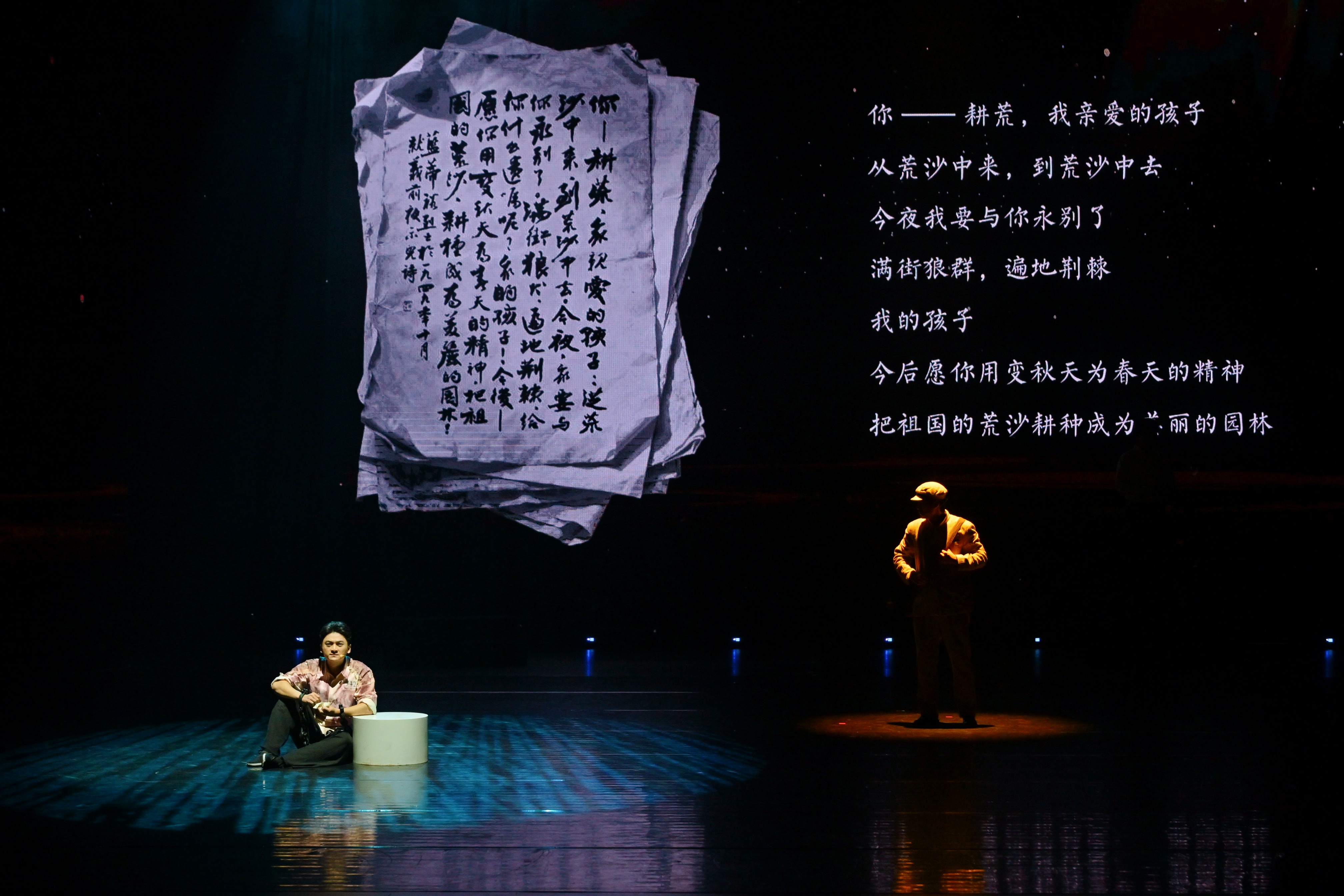 舞台灯光渐暖,由演员饰演的老年“蓝耕荒”深情讲述父亲蓝蒂裕留下的76字《示儿》诗稿。大屏幕上,通过AI技术复原的“蓝蒂裕”形象从历史的“囚窗”中走出,两代人在“盛世中国”实现了一场跨越时空的对话,“荒沙终将成林”的殷切嘱托感人至深。