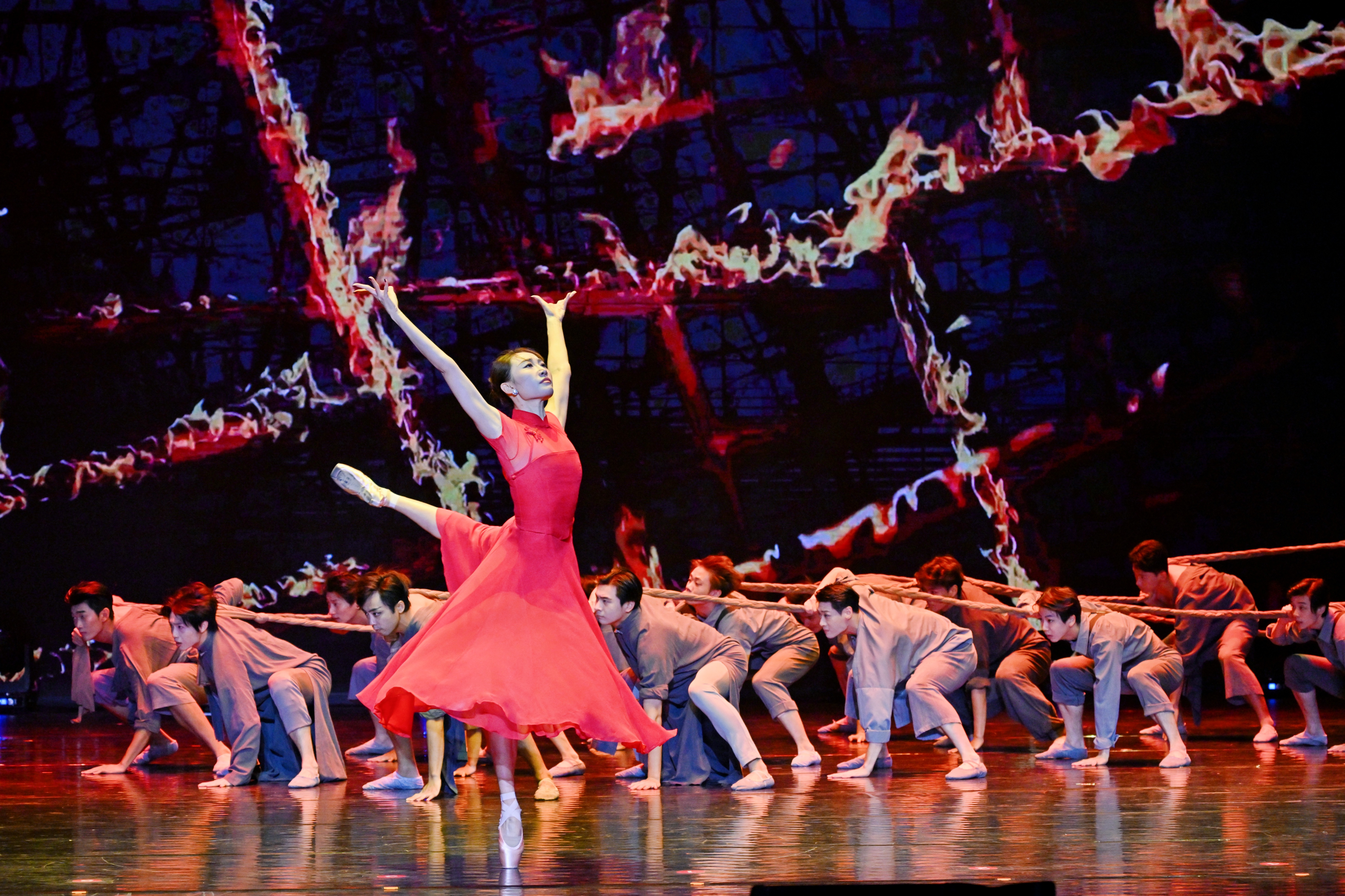 音乐渐起,重庆芭蕾舞团演员足尖轻点舞台,旋转、跳跃……一曲《归来红菱艳》再现抗战时期以舞为战的场景,仿佛将观众带回烽火岁月。