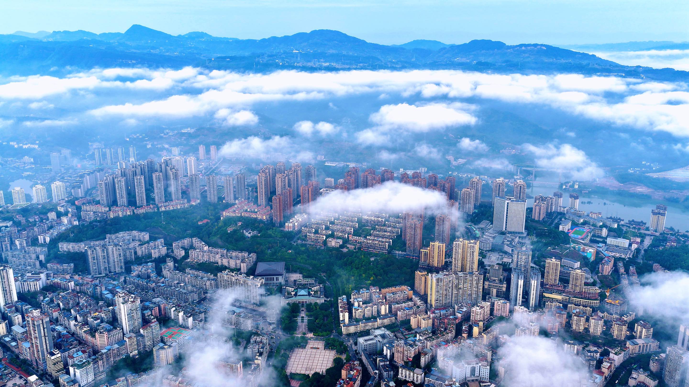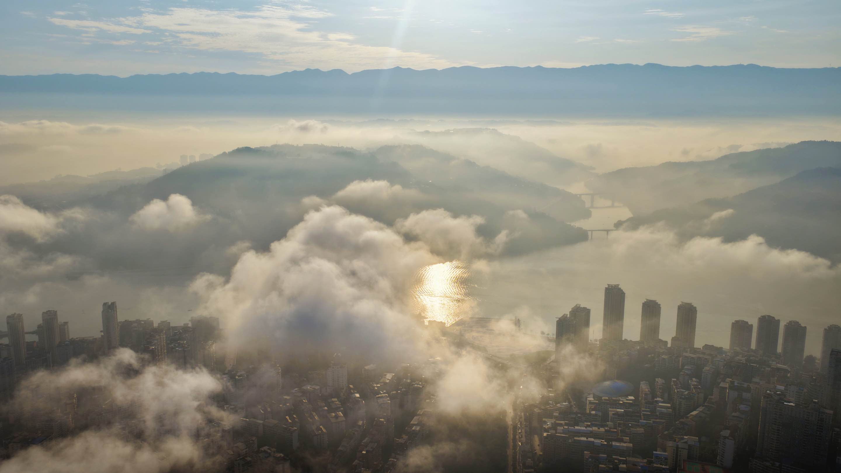 10月29日清晨,长江忠县段出现大范围流云景观,缥缈的云烟缭绕山河之间,美轮美奂,宛若仙境。从天子山上空俯瞰,绵延不断的流云仿佛给忠县县城盖上了一床厚厚的棉被。江风徐来,云雾随风游走在街区楼栋之间,好一幅美不胜收的自然画卷。