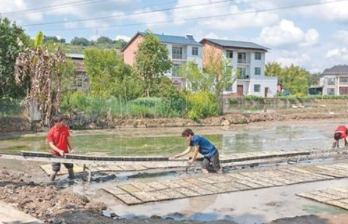 “人数相同的情况下,利用‘天车’一天能摆8000盘,折合4亩地,快4倍。”周腾鹏说,“重庆丘陵广布,机械传送带还能突破地形限制,更方便。”待幼苗长壮、裹成卷,再用传送带送回路边,运去大田插秧。