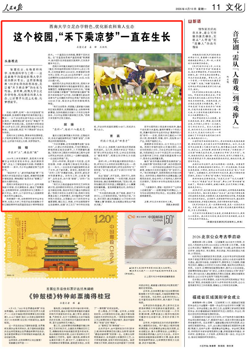 智慧农业、生物育种科学、生物质科学与工程……这是袁隆平的母校西南大学开设的新兴专业。这所即将迎来120岁生日的西部高校,见证着“禾下乘凉梦”的生长与传扬。多年来,西南大学立足办学特色,优化新农科育人生态,让好苗子向泥土扎根、向梦想拔节。
