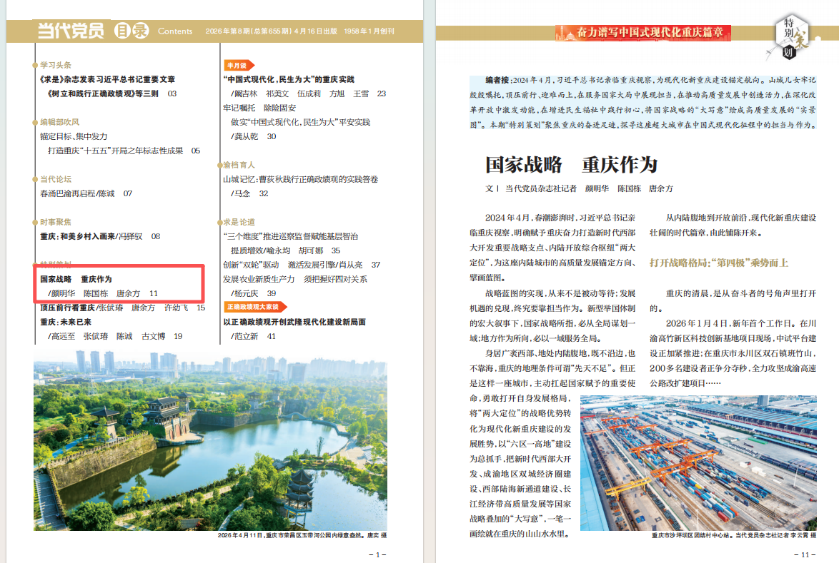 编者按:2024年4月,习近平总书记亲临重庆视察,为现代化新重庆建设锚定航向。山城儿女牢记殷殷嘱托,顶压前行、迎难而上,在服务国家大局中展现担当,在推动高质量发展中创造活力,在深化改革开放中激发动能,在增进民生福祉中践行初心,将国家战略的“大写意”绘成高质量发展的“实景图”。本期“特别策划”聚焦重庆的奋进足迹,探寻这座超大城市在中国式现代化征程中的担当与作为。