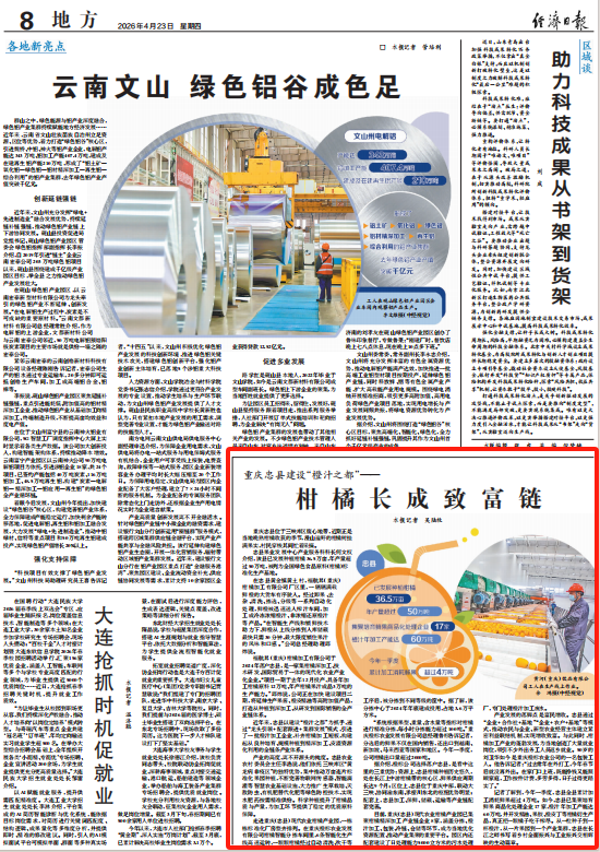 据介绍,橙标公司选择落户忠县,是看中这里的三重优势:资源上,忠县柑橘种植历史悠久,处在长江上中游柑橘带的核心区,鲜果供应周期长达9个月;区位上,忠县位于重庆中部,联动大三峡、协同渝东南、承接川东北的枢纽优势明显;配套上,忠县加工、保鲜、储藏、运输等产业链配套完善。