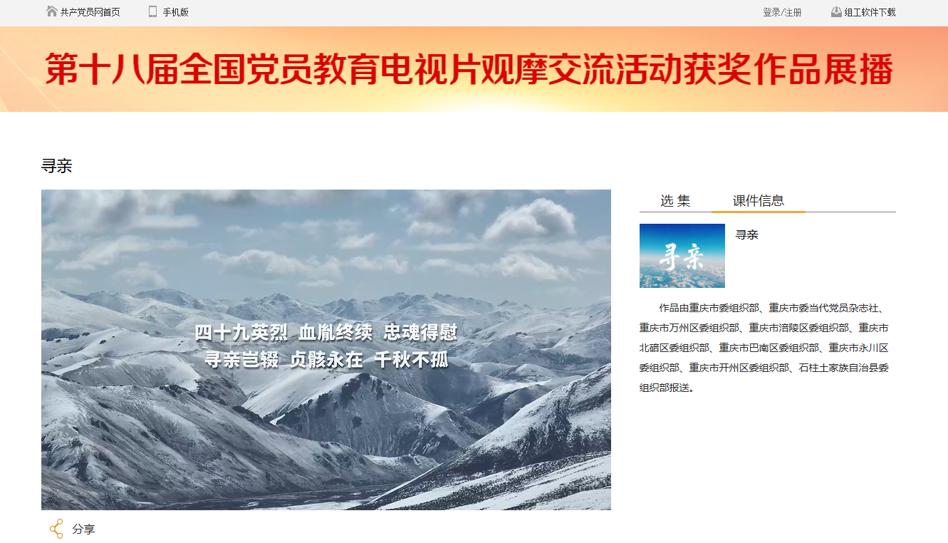 4月22日,共产党员网发布第十八届全国党员教育电视片观摩交流活动获奖作品展播,由重庆市委组织部牵头,联合重庆市委当代党员杂志社和重庆市万州区委组织部、涪陵区委组织部、北碚区委组织部、巴南区委组织部、永川区委组织部、开州区委组织部、石柱土家族自治县委组织部共同打造的荣获纪录片类三等奖的作品《寻亲》正式上线。