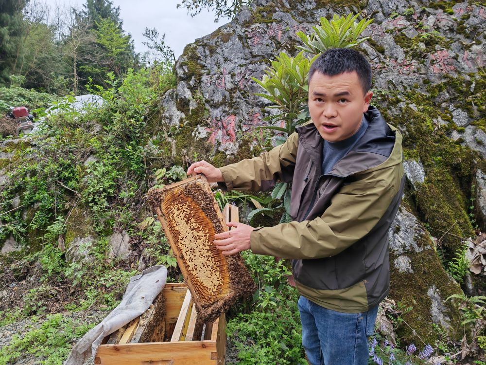 在头渡镇柏枝村海拔1200米的重庆市中华蜜蜂南川保种场,养蜂人唐洪介绍:“我们选育出的金佛山中蜂具有群势强、分蜂性弱、产蜜量高、抗病性强等优势。”
