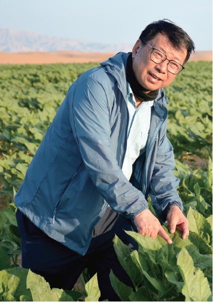 在乌兰布和沙漠基地里,最让易志坚自豪的是一片布满荒草的改善田地。这片地距离试验田的入口有两公里,布满了质感粗粝的耐旱植被。试验田经常有很多人来观光学习,但没人对这片荒草地感兴趣。更多的人会被基地里连片金黄的向日葵花吸引目光,会对沙地萝卜的清香口感赞不绝口,或者对脚下青绿色的土地感兴趣:“这是因为地上长了青苔,也叫生物结皮,这表明改造后的沙漠已经具备了土壤的特性,且性能良好。”易志坚解释道。