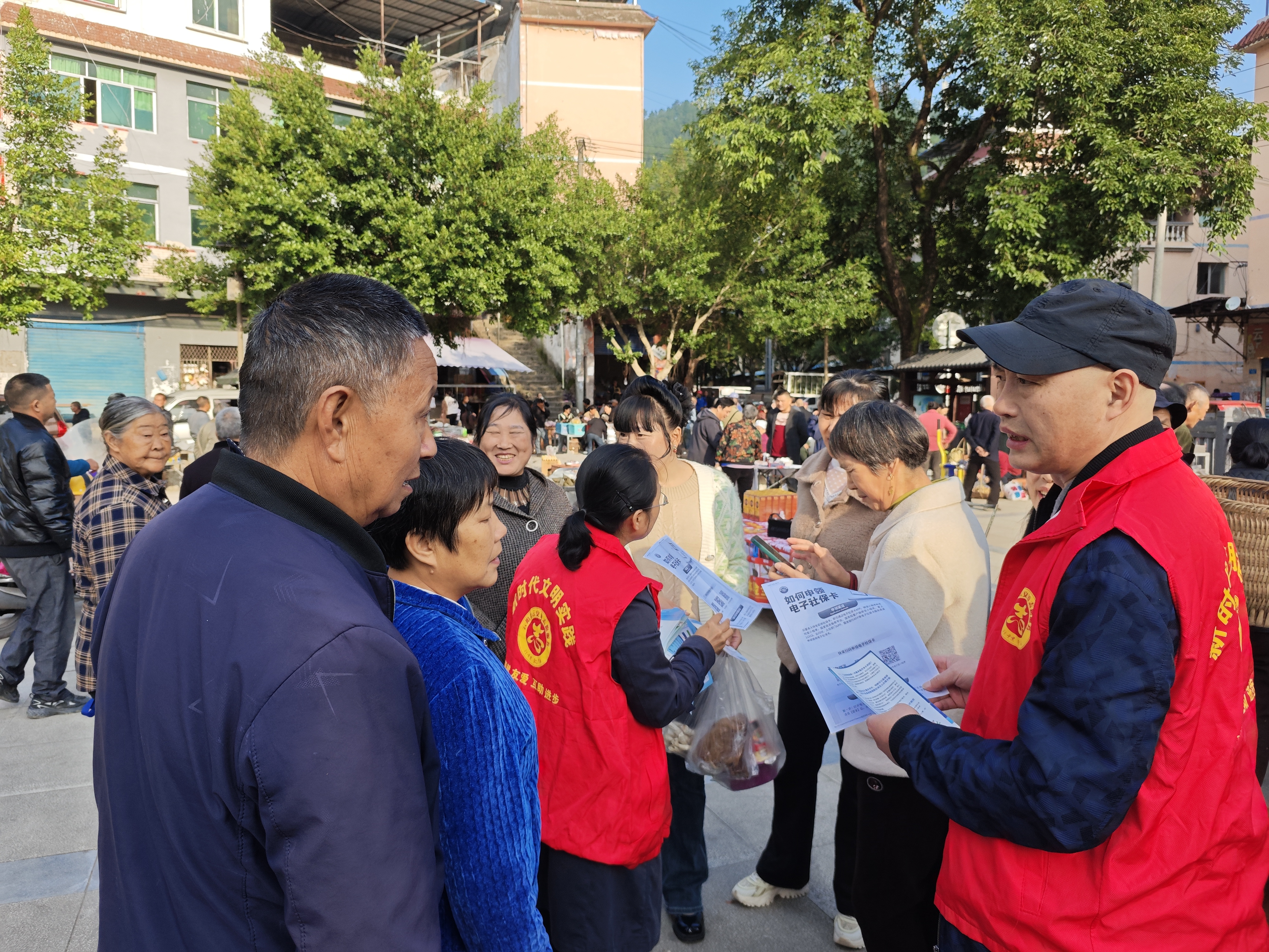 11月3日,重庆市云阳县云安镇组织多名熟悉政策的业务骨干组成志愿服务队走上街头,利用赶场日在集镇设立便民服务点,开展医保政策宣传、电子社保卡注册、反诈知识普及等系列志愿服务活动,让群众在“家门口”享受贴心服务。