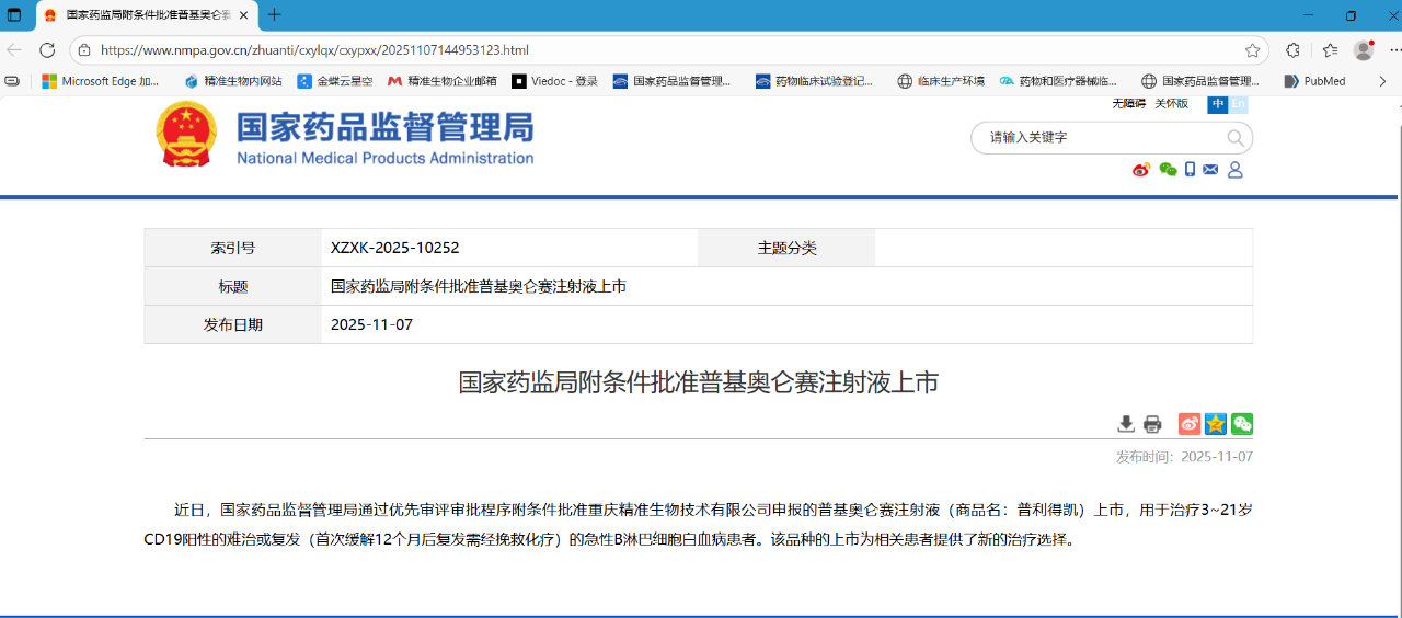 记者从重庆市经济信息委了解到,由重庆精准生物技术有限公司自主研发的国家一类生物新药“普基奥仑赛注射液”(商品名:普利得凯®)于11月7日获得国家药品监督管理局批准上市。