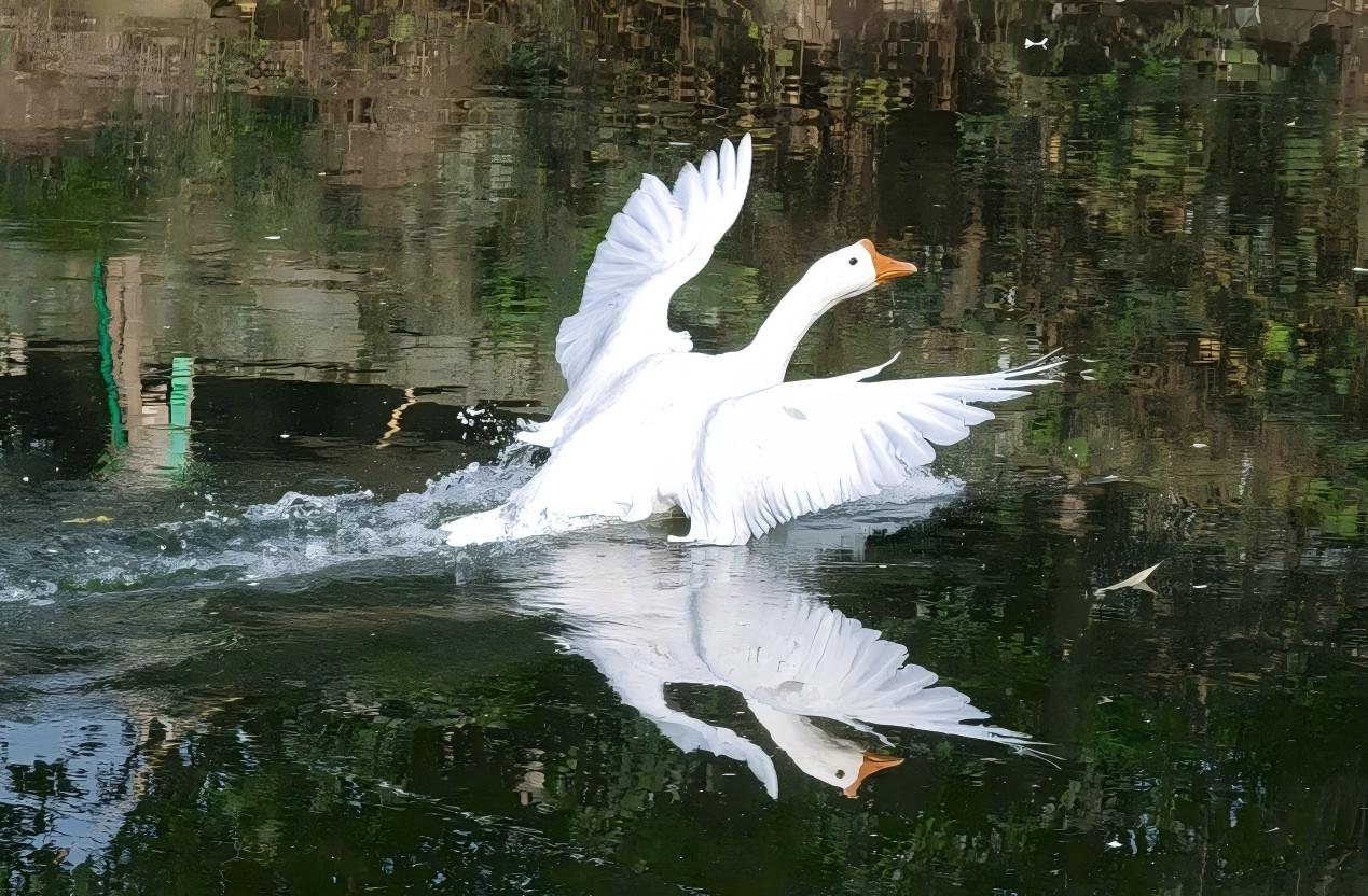 突然,头顶上阴着的天空亮开了一方,一朵揉碎的白云像一片神鸟的羽翼斜插在山峦上,倒映在鱼塘里,虚幻的神鸟居然在眼前的天际线上神奇般地展翅欲飞。老大爷说,只要经常来,有许多城里看不到的风景,在这儿能看到。话音未落,用篱笆圈在塘边上的几只白鹅像听到了口令似的,一起展翅,或许是阳光来了,或许是想到塘里戏水了,也或许是“囚禁”久了想要逃离,激昂的一阵“嘎——嘎——嘎嘎”的声音,有些刺耳,真让没有心理准备的我惊了一跳。转眼间,两只白鹅像热恋般地展翅扑腾了四五次,终于翻进鱼塘后,像蜻蜓点水一样地轻盈,双双展翅划浪飞向自由世界。我赶紧用手机抓拍,留下了那惊艳的一刻。在时光的清响里,目睹了“白鹅也有天鹅梦”的高光瞬间。意料不到的是,两只白鹅又很快地平静下来,缓缓地从对岸游了回来,或许是舍不得还在篱笆里一直守望它俩的伙伴们。于是,两只白鹅用同样方式进攻出去,遗憾的只有一只成功。接下来的是,一只白鹅在篱笆外水里游,一只白鹅在篱笆内旱地走,都用嘴来回触摸着篱笆,一声又一声地鸣叫,声嘶力竭,相互加油,难舍难分的一支恋曲,听得山水有些动容了,惊飞的鸟儿腾空盘旋……