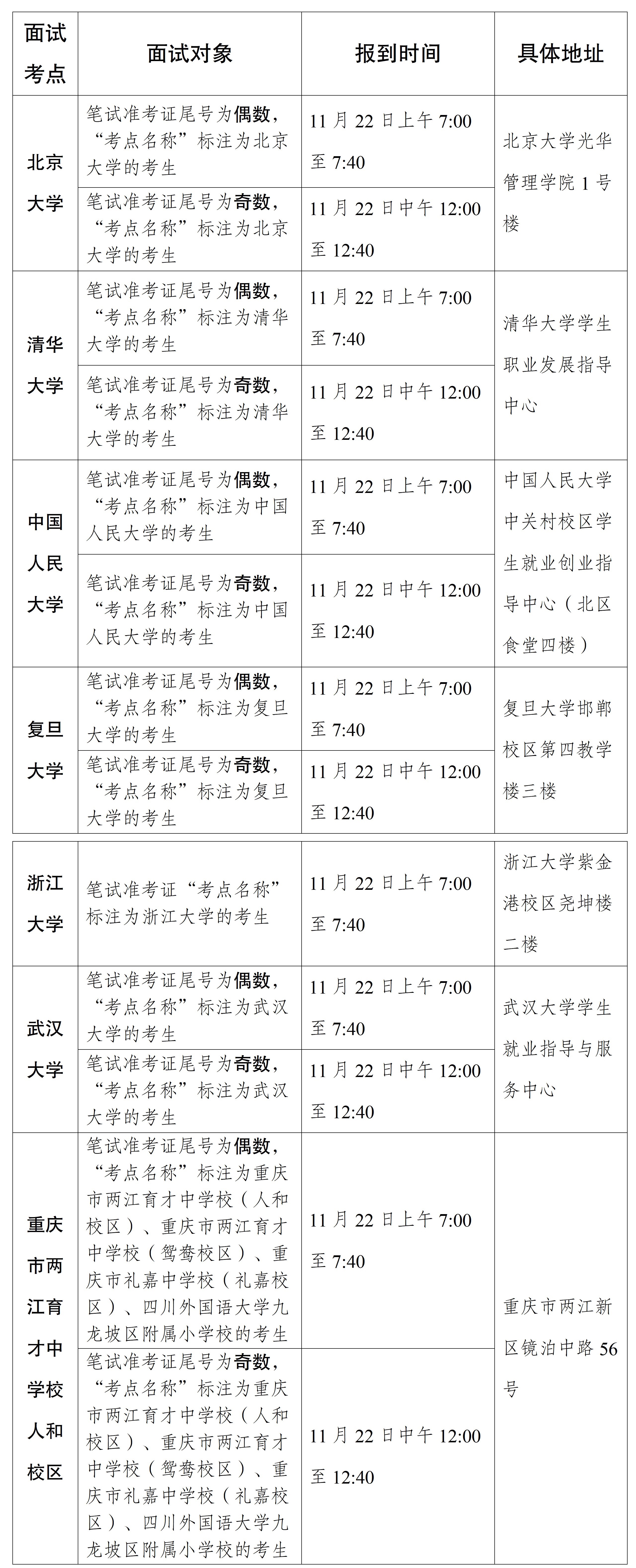 (二)面试地点。在北京大学、清华大学、中国人民大学、复旦大学、浙江大学、武汉大学等6所高校和重庆市两江育才中学校(人和校区)设置面试考点。具体安排如下: