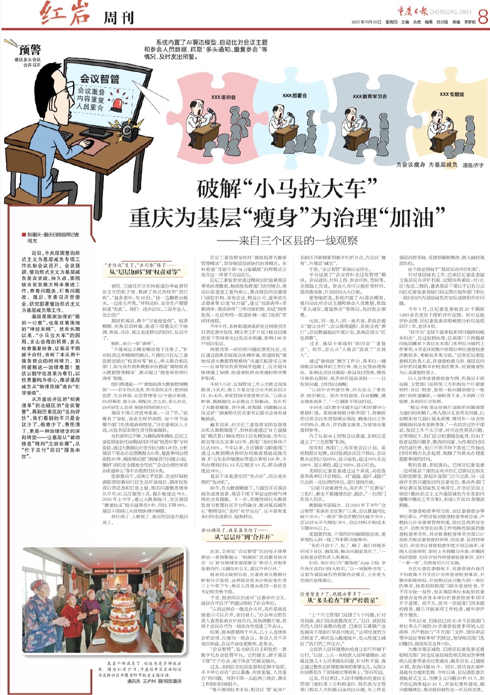 会议精简了,政策落实快了——从“层层开”到“合并开”此前,北碚区“会议智管”后台电子屏幕弹出一条预警提示:“检测到‘党员教育培训会’与‘新兴领域党建部署会’参会人员很多是重合的,议题存在交叉,建议合并召开。”