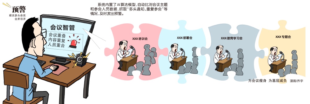 更智能的是,系统内置了AI算法模型,能自动比对会议主题和参会人员数据,抓取“多头通知、重复参会”等情况,及时发出预警。