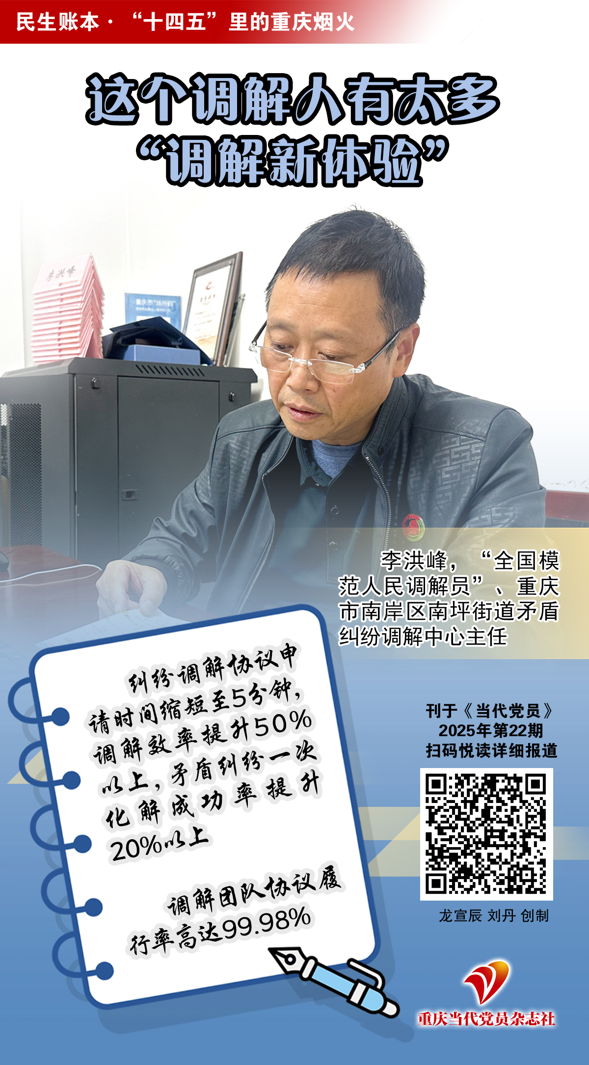 今天推出“民生账本•‘十四五’里的重庆烟火”系列报道第8期《这个调解人有太多“调解新体验”》,讲述重庆市南岸区南坪街道矛盾纠纷调解中心主任李洪峰在重庆积极探索超大城市现代化治理新路子、不断深化新时代“枫桥经验”大背景下,亲身经历基层调解工作的新变化。