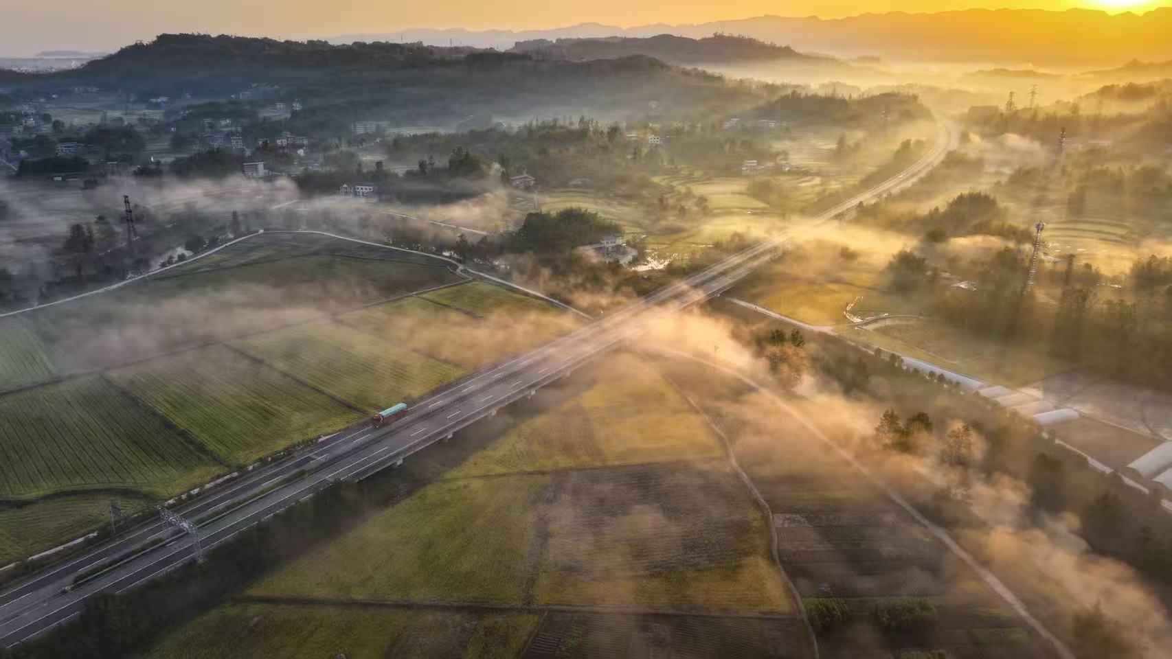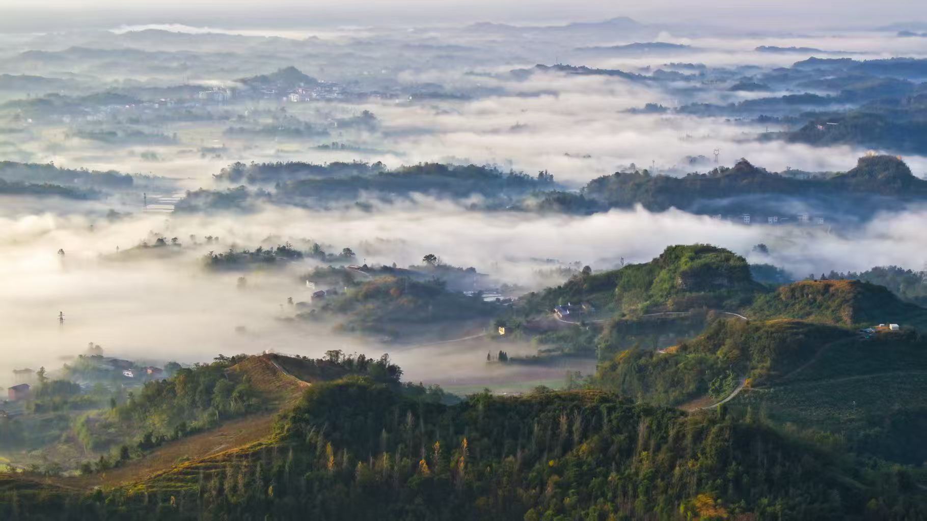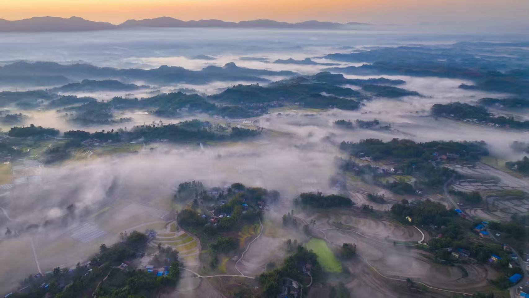 11月26日,重庆市梁平区金带街道的山谷间,朦胧的晨雾轻轻弥漫——暖黄晨曦先染透天边,再顺着云隙漫向层叠丘陵……青黛山尖半隐在雾纱里,蜿蜒村道在雾中露出浅白的线条,整个世界仿佛被温柔地包裹起来,变得朦胧而神秘。