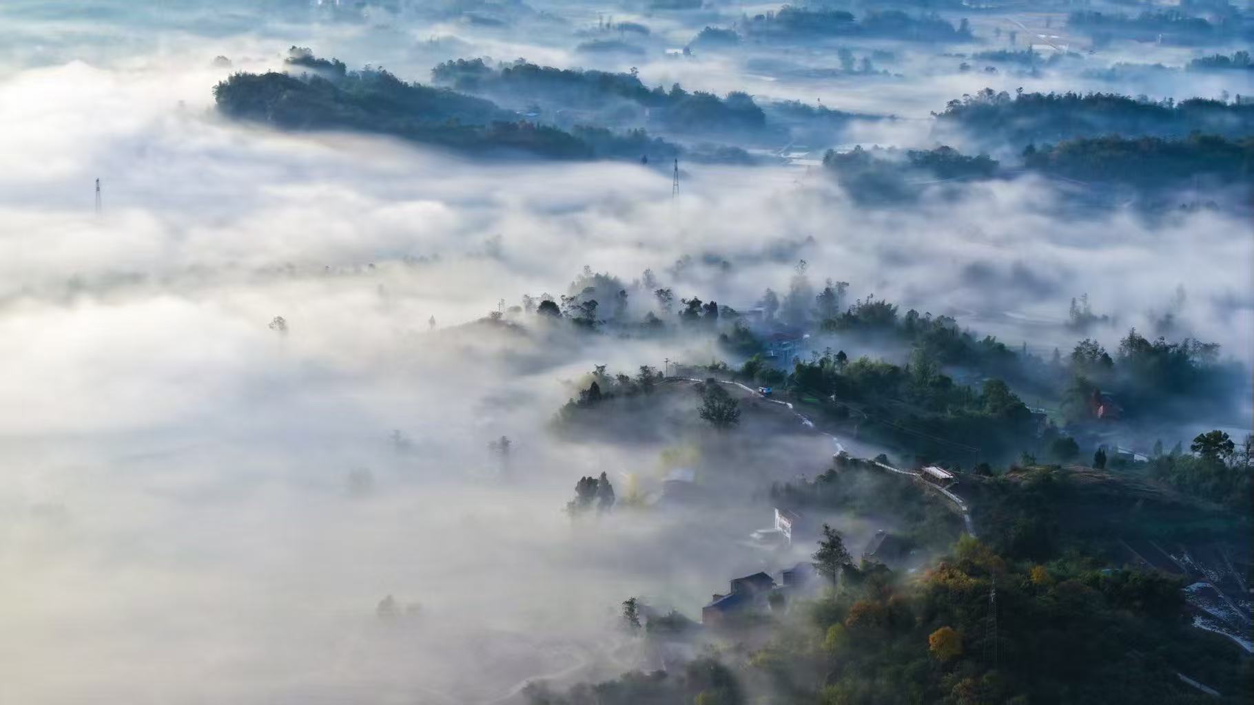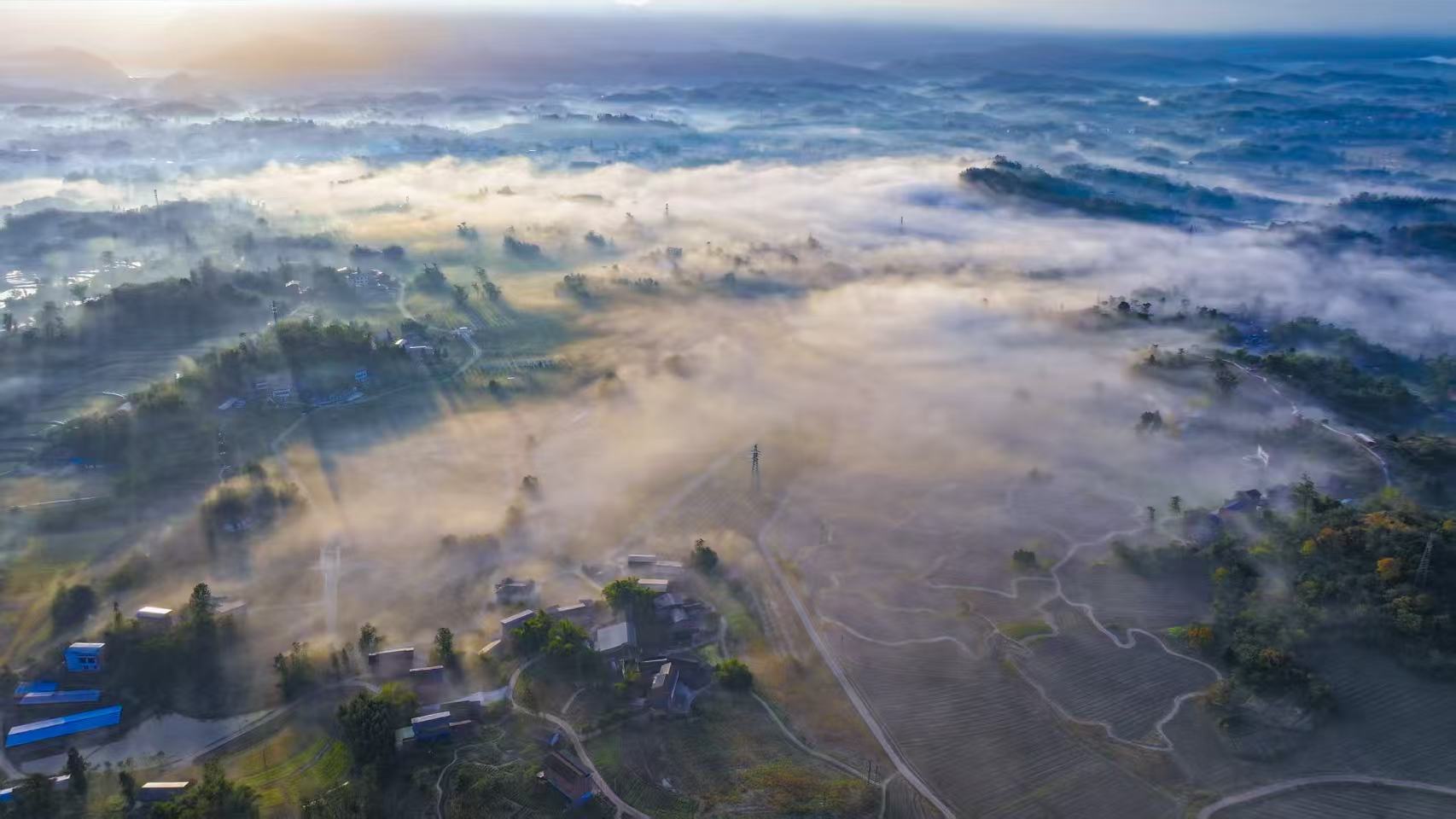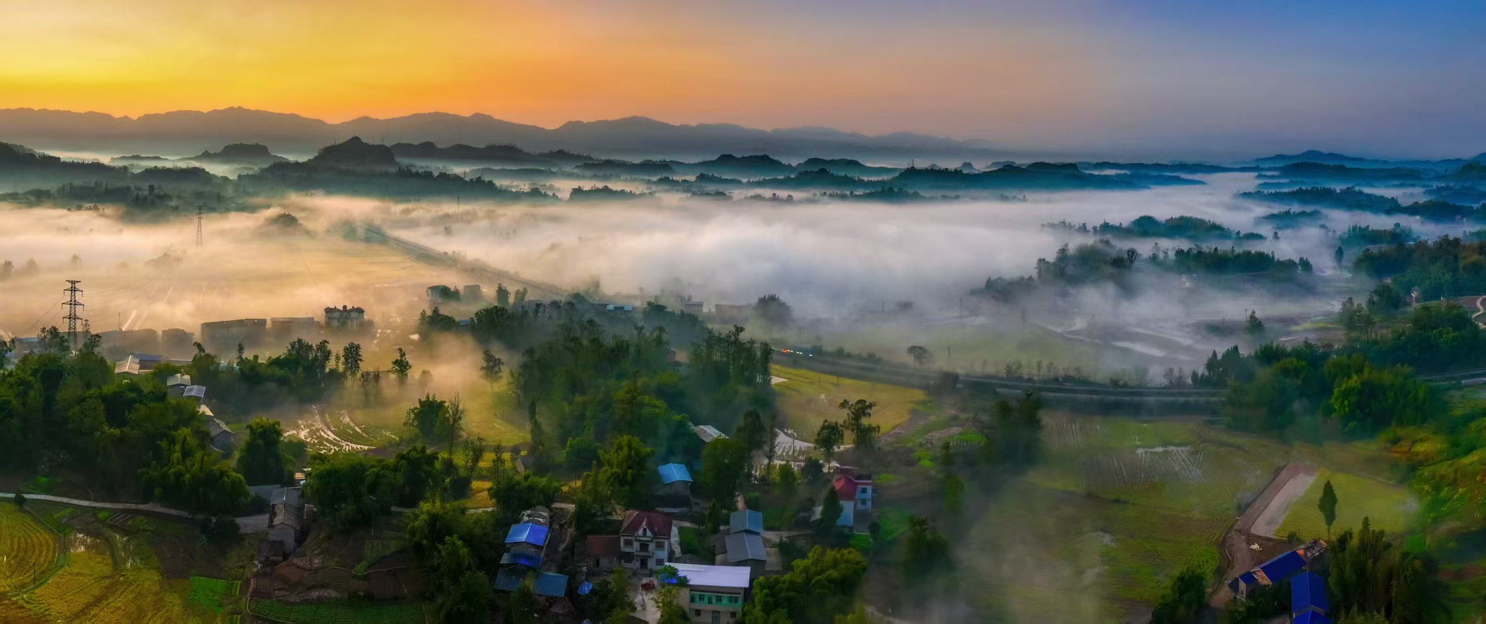 11月26日,重庆市梁平区金带街道的山谷间,朦胧的晨雾轻轻弥漫——暖黄晨曦先染透天边,再顺着云隙漫向层叠丘陵……青黛山尖半隐在雾纱里,蜿蜒村道在雾中露出浅白的线条,整个世界仿佛被温柔地包裹起来,变得朦胧而神秘。
