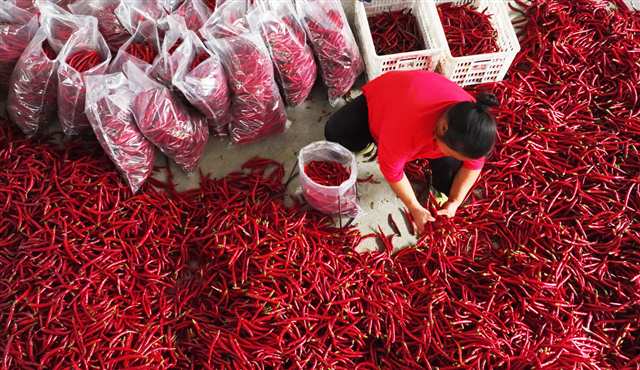 ▲火锅产业的发展带动了产业链上的农民增收。图为黔江区黑溪镇辣椒丰收。特约摄影 杨敏/视觉重庆