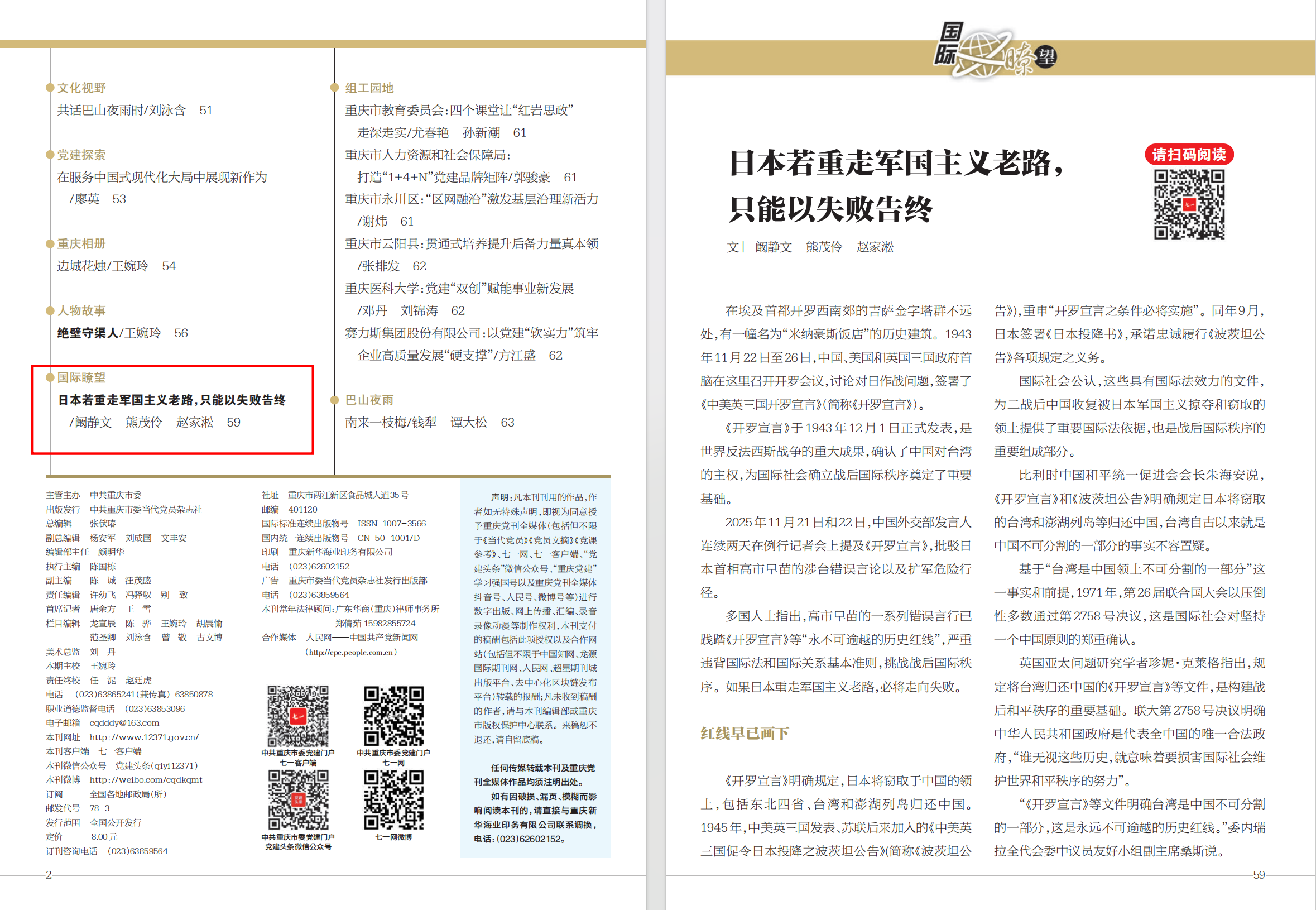 多国人士指出,高市早苗的一系列错误言行已践踏《开罗宣言》等“永不可逾越的历史红线”,严重违背国际法和国际关系基本准则,挑战战后国际秩序。如果日本重走军国主义老路,必将走向失败。