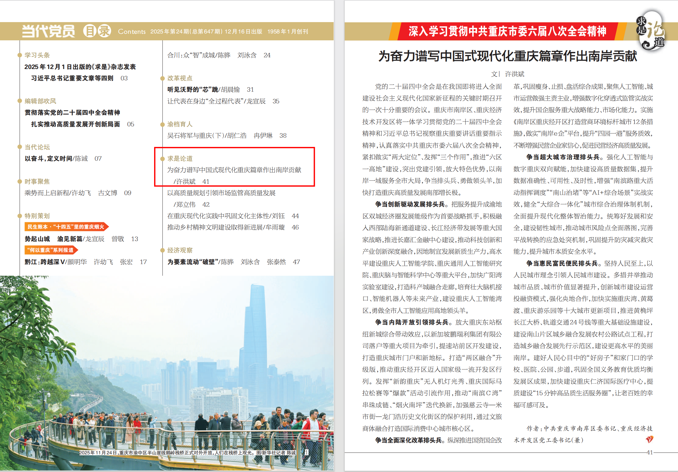 党的二十届四中全会是在我国即将进入全面建设社会主义现代化国家新征程的关键时期召开的一次十分重要的会议。重庆市南岸区、重庆经济技术开发区将一体学习贯彻党的二十届四中全会精神和习近平总书记视察重庆重要讲话重要指示精神,认真落实中共重庆市委六届八次全会精神,紧扣做实“两大定位”、发挥“三个作用”,推进“六区一高地”建设,突出党建引领,放大特色优势,以南岸一域服务全市大局,争当排头兵、勇做领头羊,加快打造重庆高质量发展南部增长极。