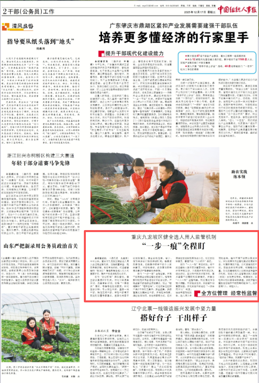 今年以来,重庆市九龙坡区健全选人用人全过程监管机制,加强前置审查、规范考察流程、做实常态问效,把监督管理的“探照灯”精准聚焦在选人用人的重要环节,提升干部选用规范化水平。