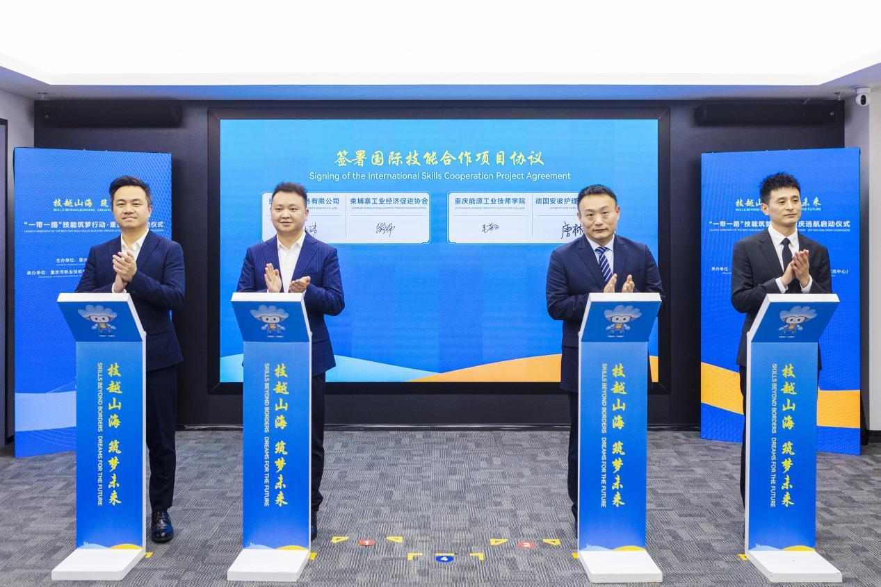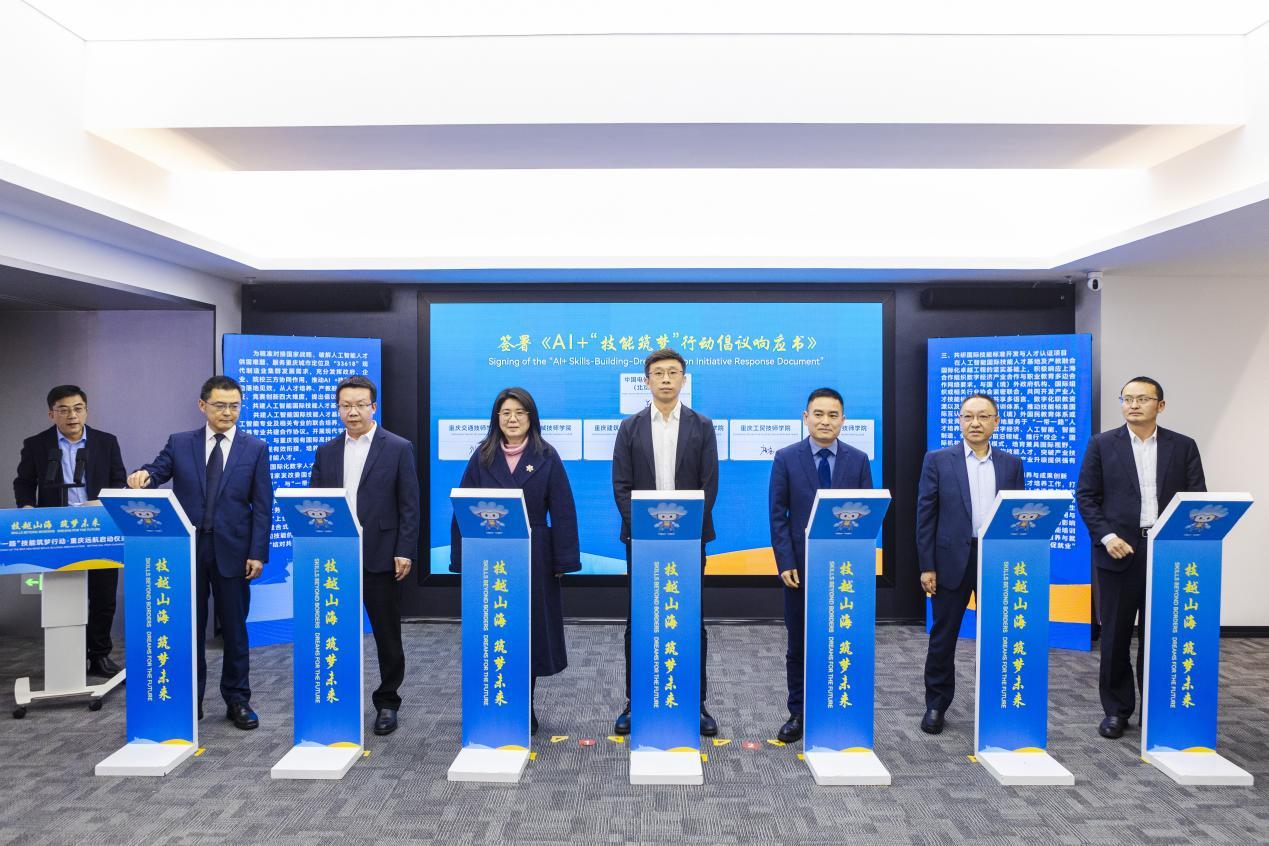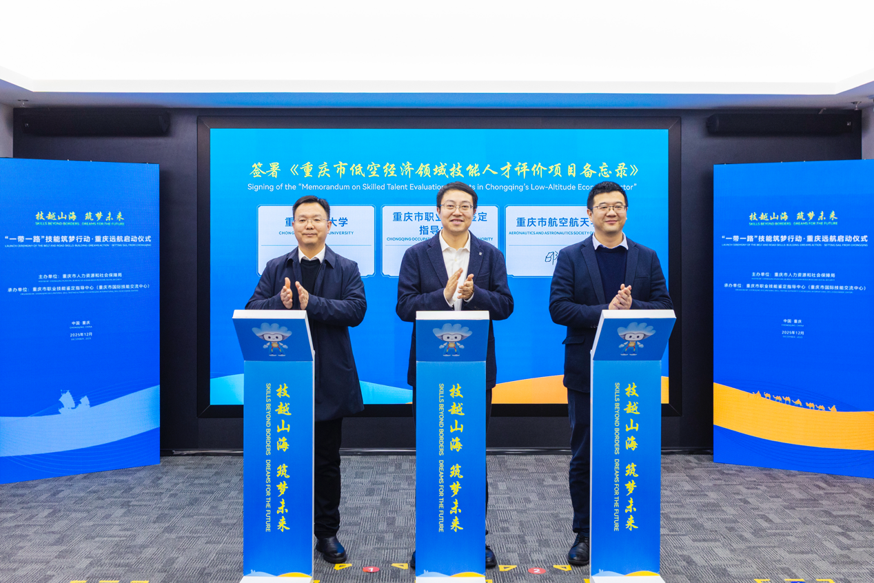 现场还举行了“一带一路”国际技能交流签约仪式,通过“产、教、才”融合、“政、校、企”联动为国际技能交流合作夯实平台基础。其中,重庆交通大学、重庆市航空航天学会、重庆市职业技能鉴定指导中心签署《重庆市低空经济领域技能人才评价项目备忘录》;重庆6家技师学院与中国电信人工智能科技(北京)有限公司签署《AI+“技能筑梦”行动倡议响应书》;2家企业单位和技工院校分别与柬埔寨、德国有关单位签署国际技能合作项目协议。
