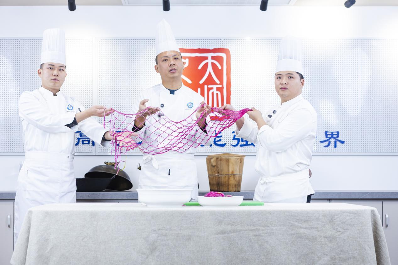 陈波中式烹调师国家级技能大师工作室的技能大师们先后上演蒙眼太极拉面、渔网萝卜、菊花文思豆腐绝技,行云流水、一气呵成的展演,将中式烹调的精湛技艺展现得淋漓尽致,引得线上线下喝彩声不断。