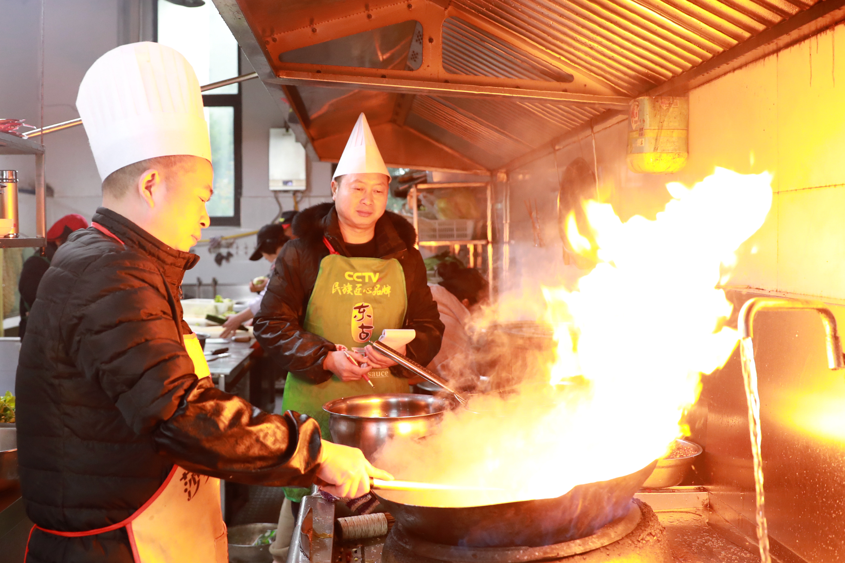 在忠县乌杨工业园区的一家餐馆,老板张政国正在厨房巡视(右一)。图/赵军