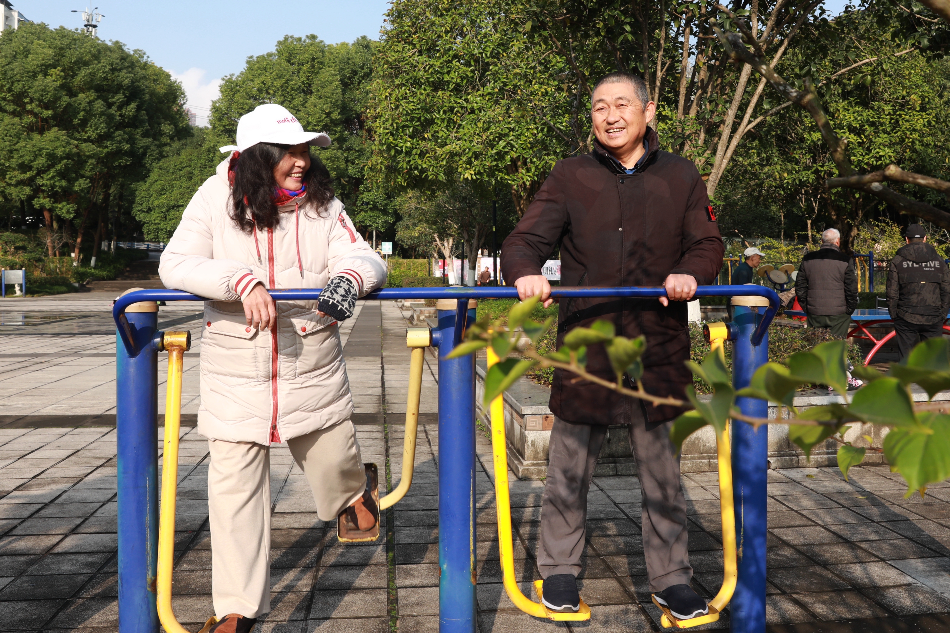 12月25日,退捕渔民彭金友(右)、张启红(左)夫妇在公园里锻炼身体。图/赵军