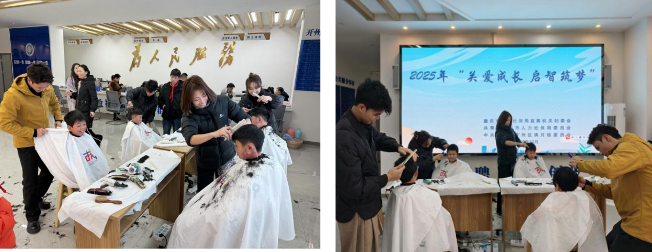 在满月镇政府一楼办事大厅,来自重庆五一职业技术学院的老师们化身“爱心理发师”,细心为孩子们修剪头发,以专业的技能为孩子们打造清爽造型,帮助他们以崭新面貌迎接新年到来,让孩子们在细节处感受到贴心关爱。