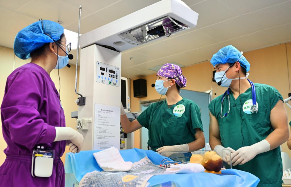 “37周新生儿,肌张力差、喘息样呼吸、羊水粪染……”近日,随着一声清脆的监护仪提示音,在陆军军医大学新桥医院麻醉科学习室,一场惊心动魄的新生儿复苏演练中,来自该院妇产科、儿科、麻醉科手术室的医护团队正与死神展开激烈较量——这是该院连续第三年举办的新生儿抢救多科协作专项培训现场。